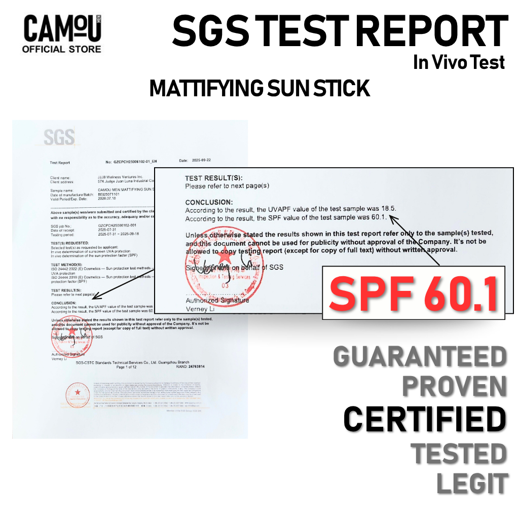 20g Camou Men's Mattifying Face Sunscreen Stick SPF 50 PA Oil Control Sweat Resistant No White Cast