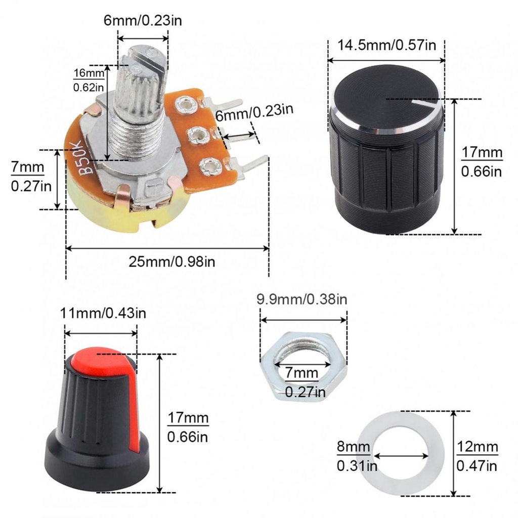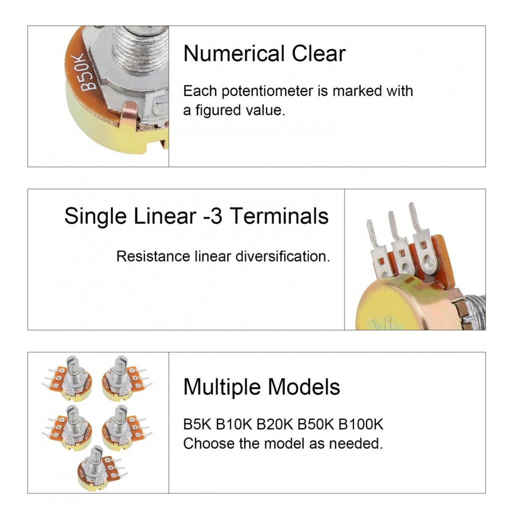 20sets 80pcs 5K 10K 20K 50K 100K Ohm Knurled Shaft Linear Rotary Taper Potentiometer with 5 Different Kinds WH148 Knob, 3 Pins Resistor
