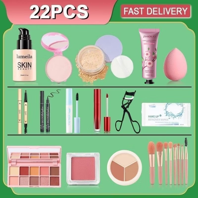 22/25 Pcs Makeup Set (Foundation+Sponge+Eyeshadow+BlushOn+Brushes+Curler+Lipstick+Mascara+Eyeliner)