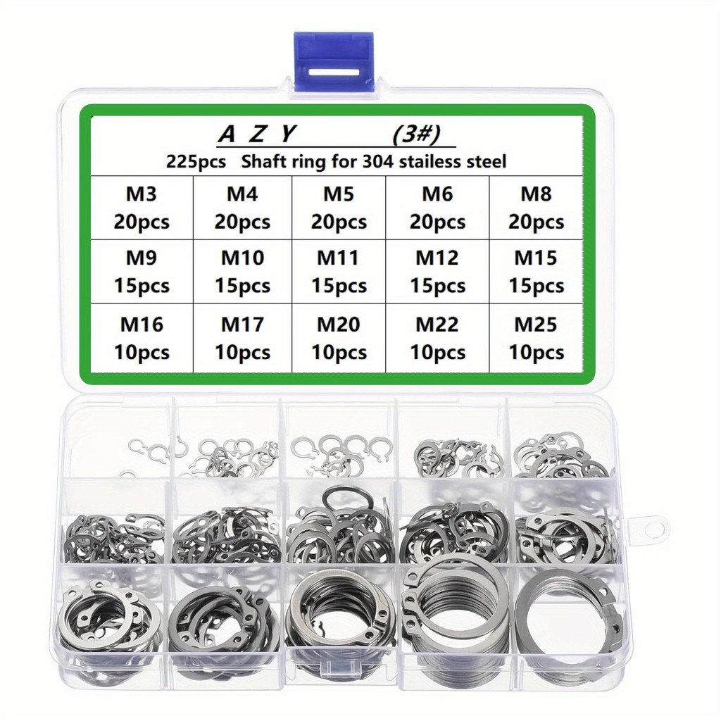 225 Pieces Boxed 304 Stainless Steel Shaft, with Elastic Fixing Ring, External Snap Ring, 15 Size External Snap Ring Combination Kit, Round Steel Wire Snap Ring for Valve Electricity