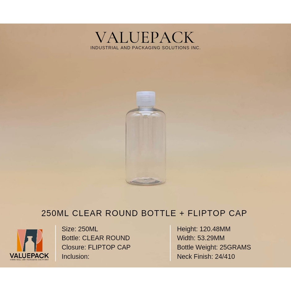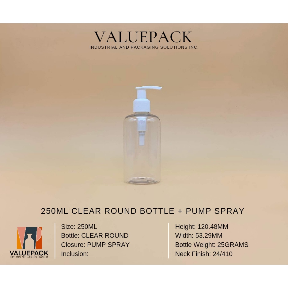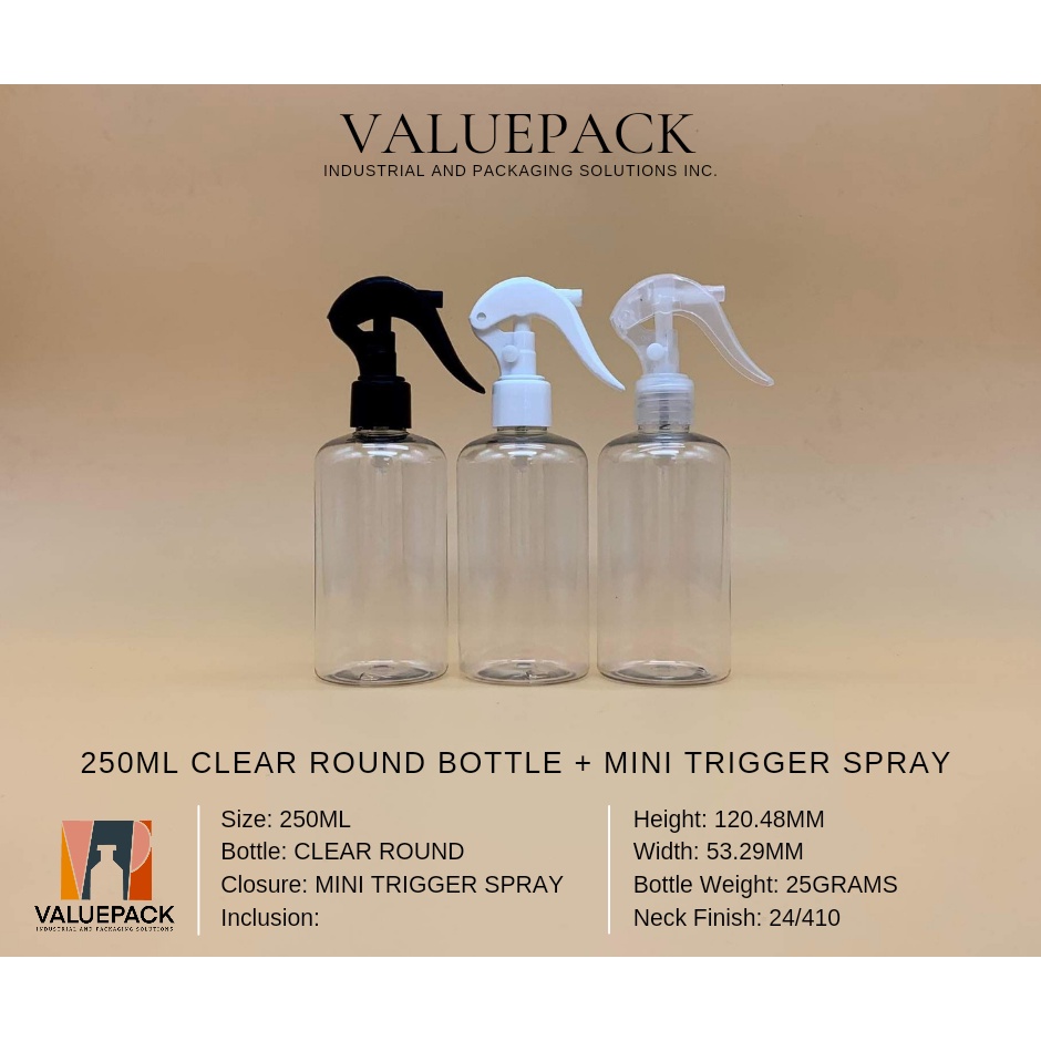 250ML CLEAR ROUND BOTTLE + MIST SPRAY, PUMP SPRAY, FLIPTOP CAP, TRIGGER SPRAY