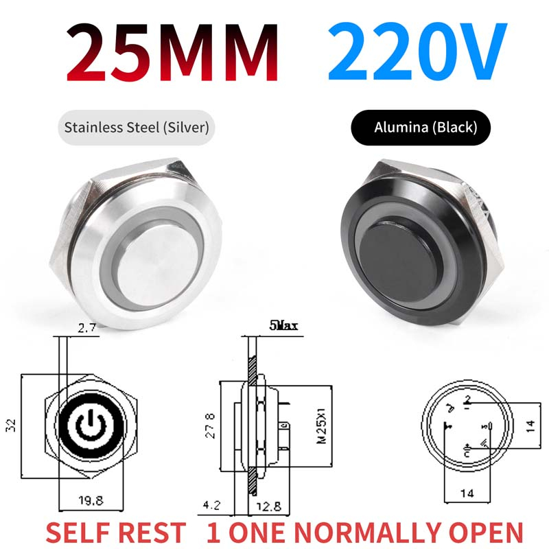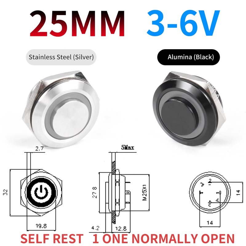 25mm 1NO High head Short Stroke Mini Waterproof Metal Push Button Switch Power Led Light Momentary 3/6/12/24/220V black white 1NO One normally open Self reset only