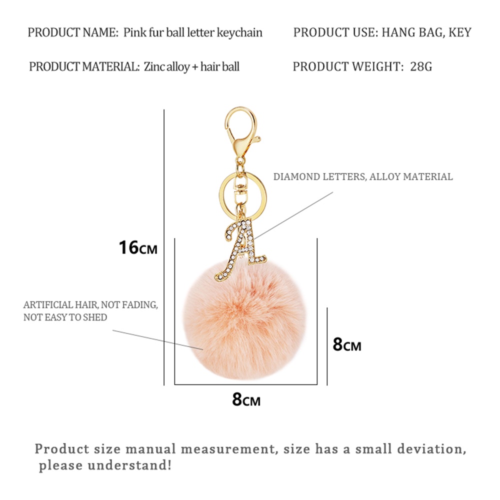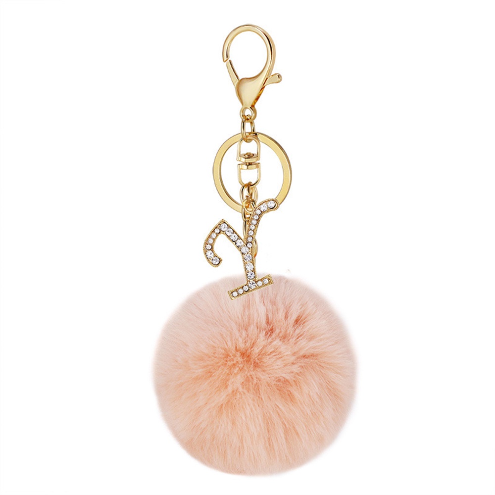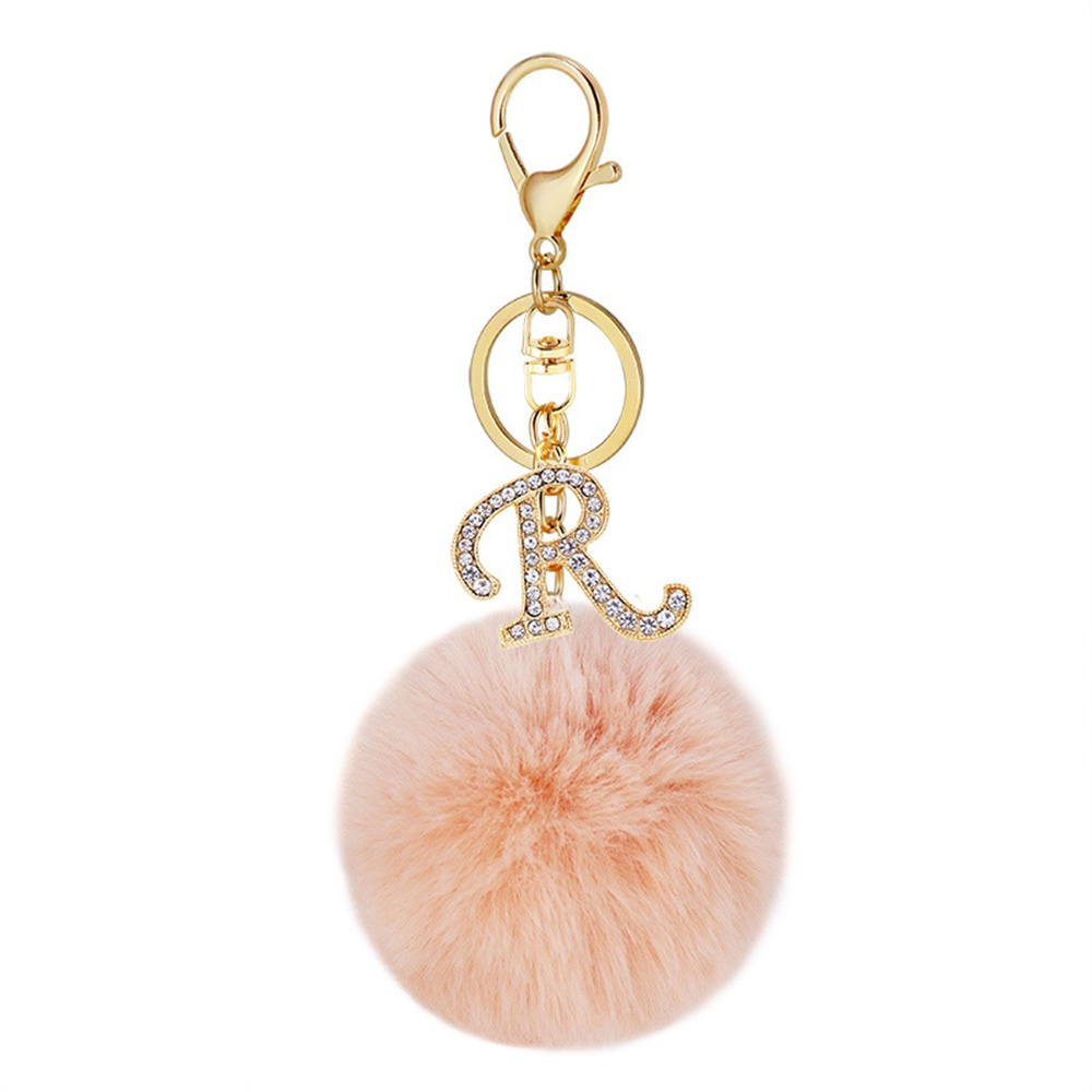 26 Letter A-Z Initials Rhinestone Alloy Keychain Charms With Pink Pompom Key Ring Car Key Holder for Women Bag Charms Accessories Gift