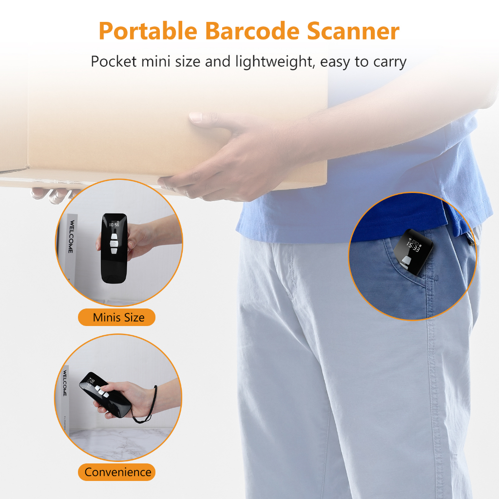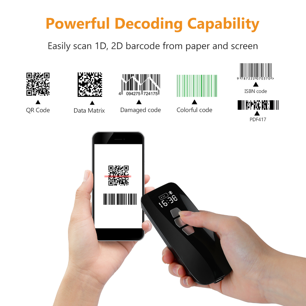 2D Bluetooth Barcode Scanner 3-in-1 Mini Bar Code Reader with LCD Screen Time, 2.4G Wireless & USB Wired Supports 1D QR Code Scanning