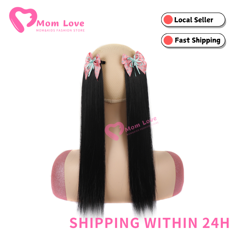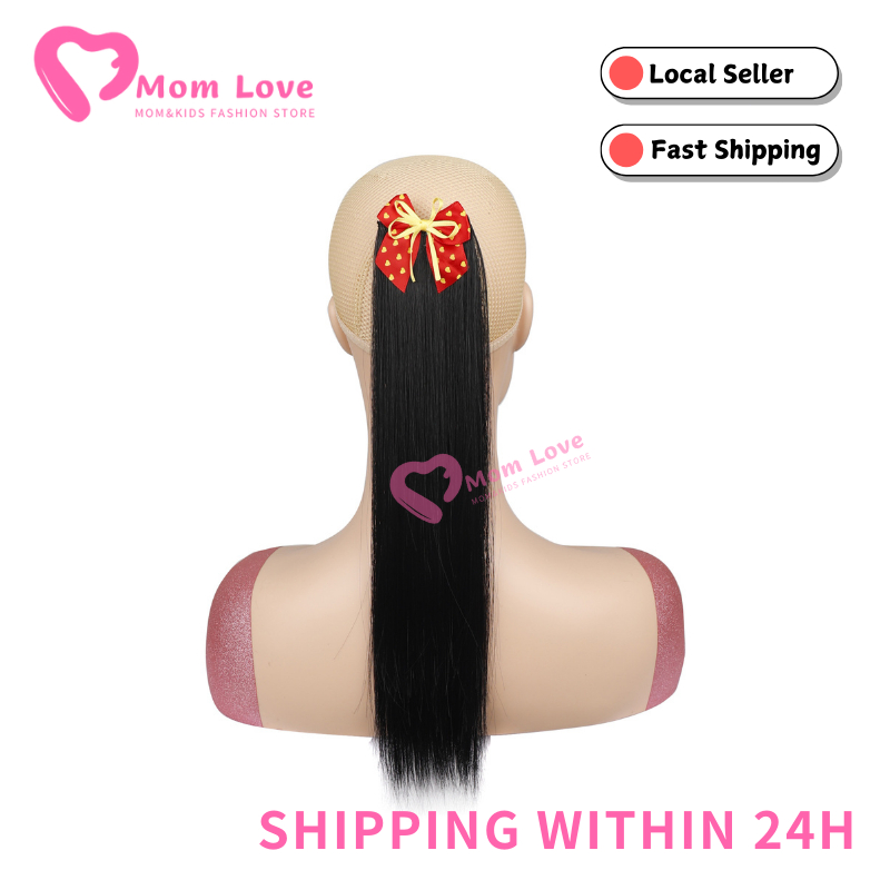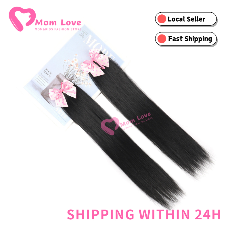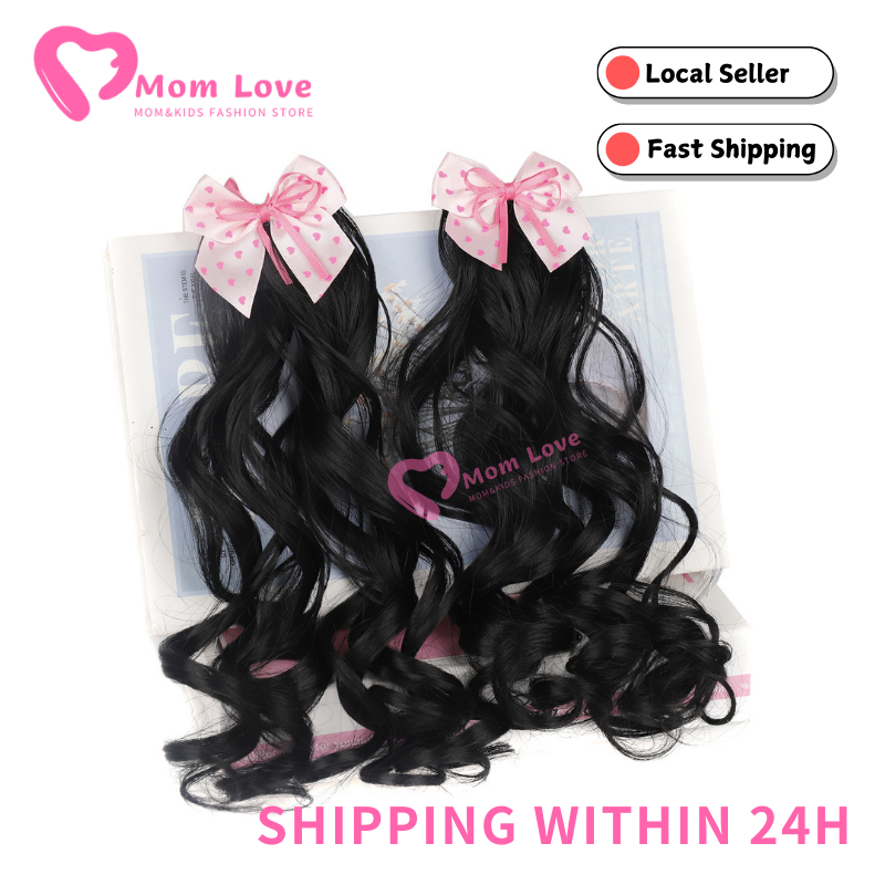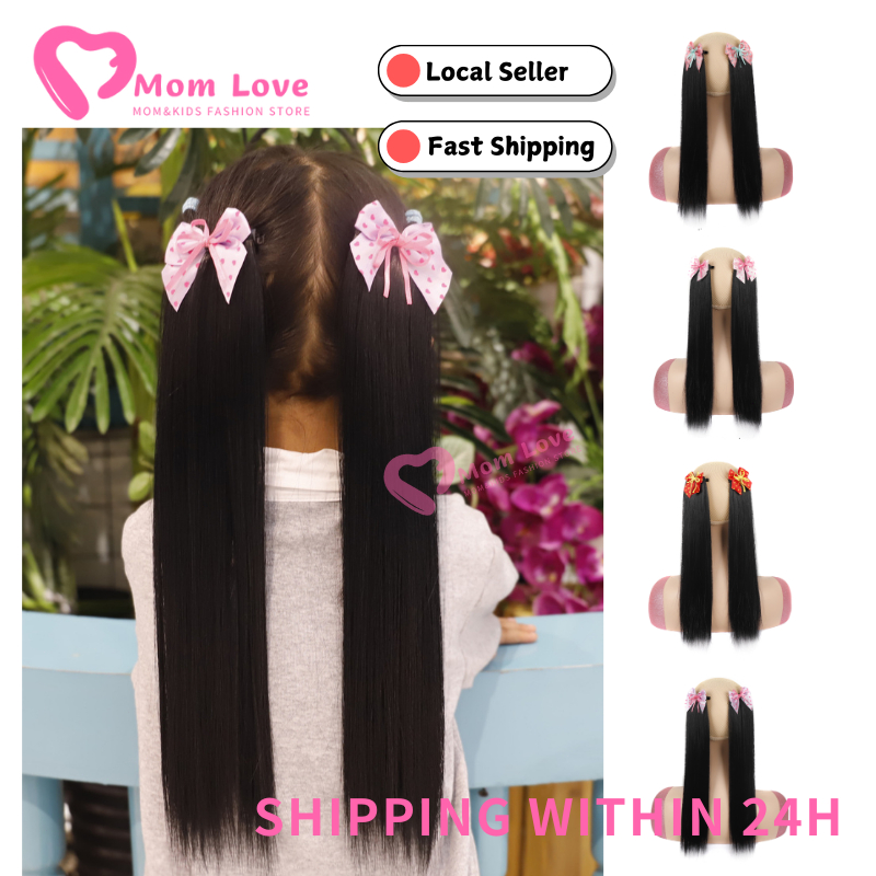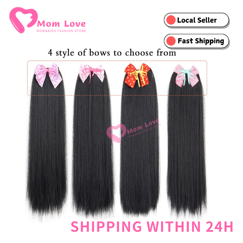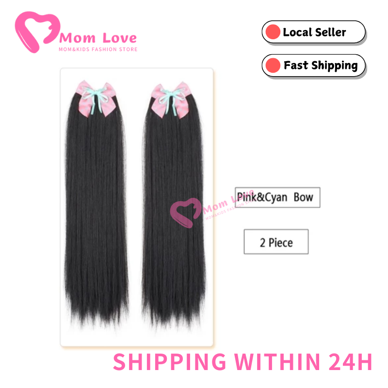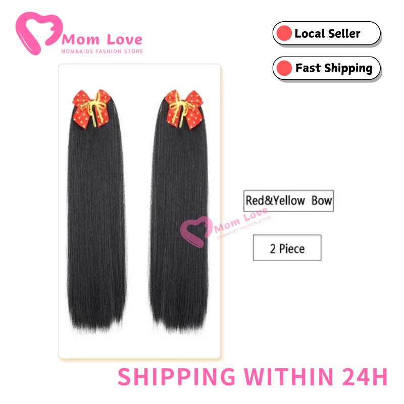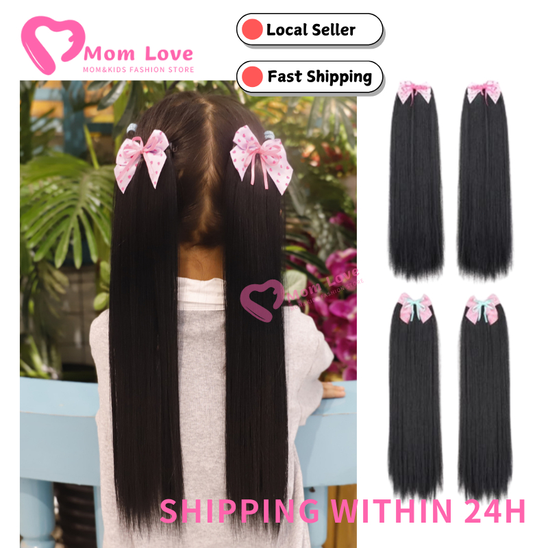 2PCS Children's Straight Ponytail Wigs Clip Type Girls Curly Synthetic Hair Extension Wigs with Bow