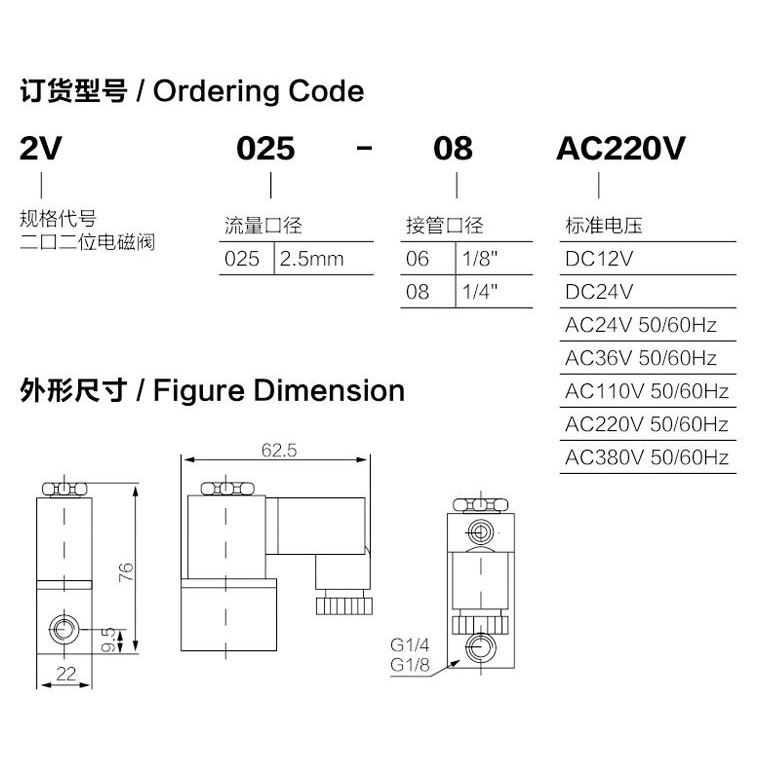 2V025-08 valve 12v 24v 220v airtac type pneumatic solenoid valve 2 Position 2 Port Normally Closed Air Magnetic Valve