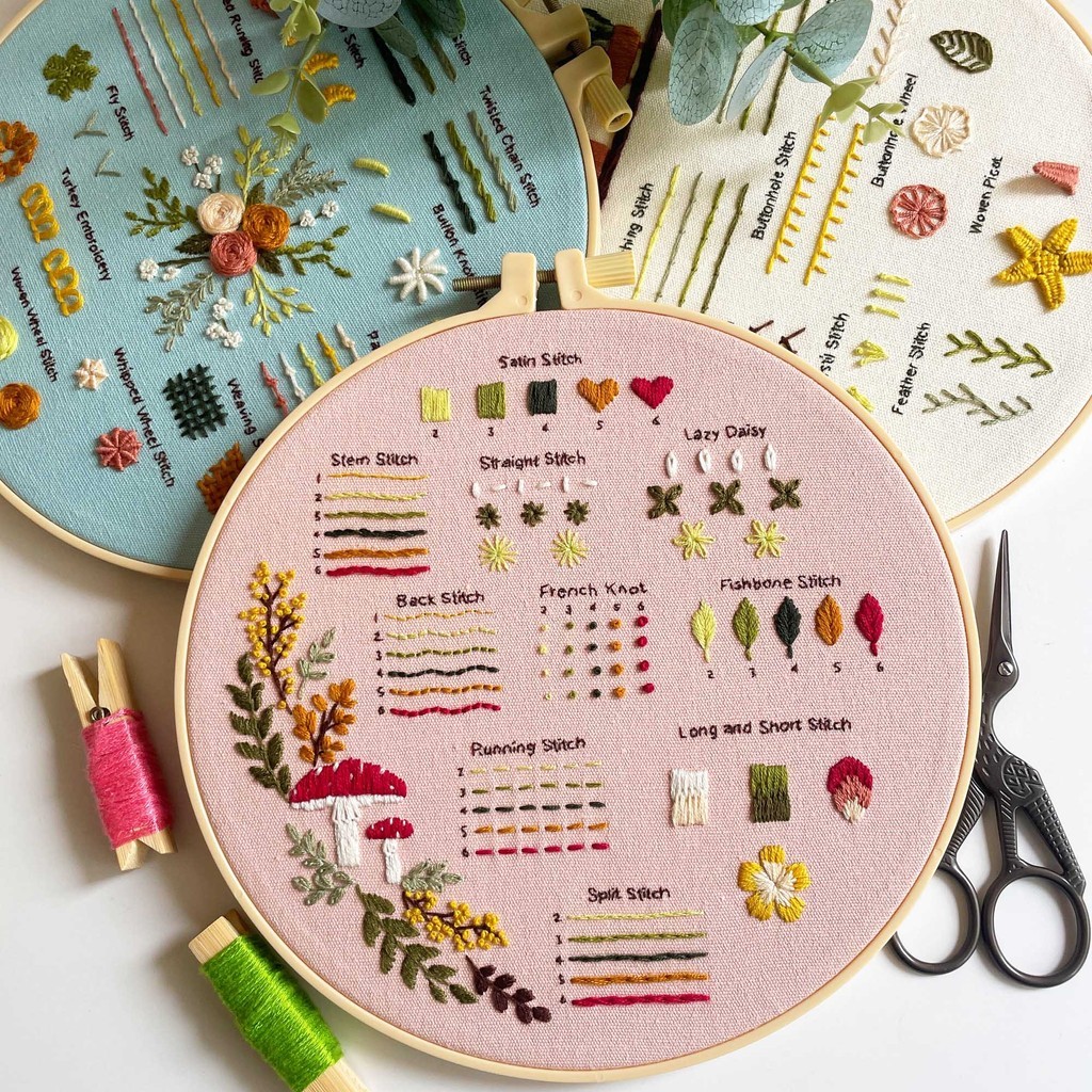 3 Embroidery kit for Beginners, Embroidery Starter Kits to Learn 30 Different Stitches, Including Fabric with Prints, Threads, Needles, Hoop and Video tutorials