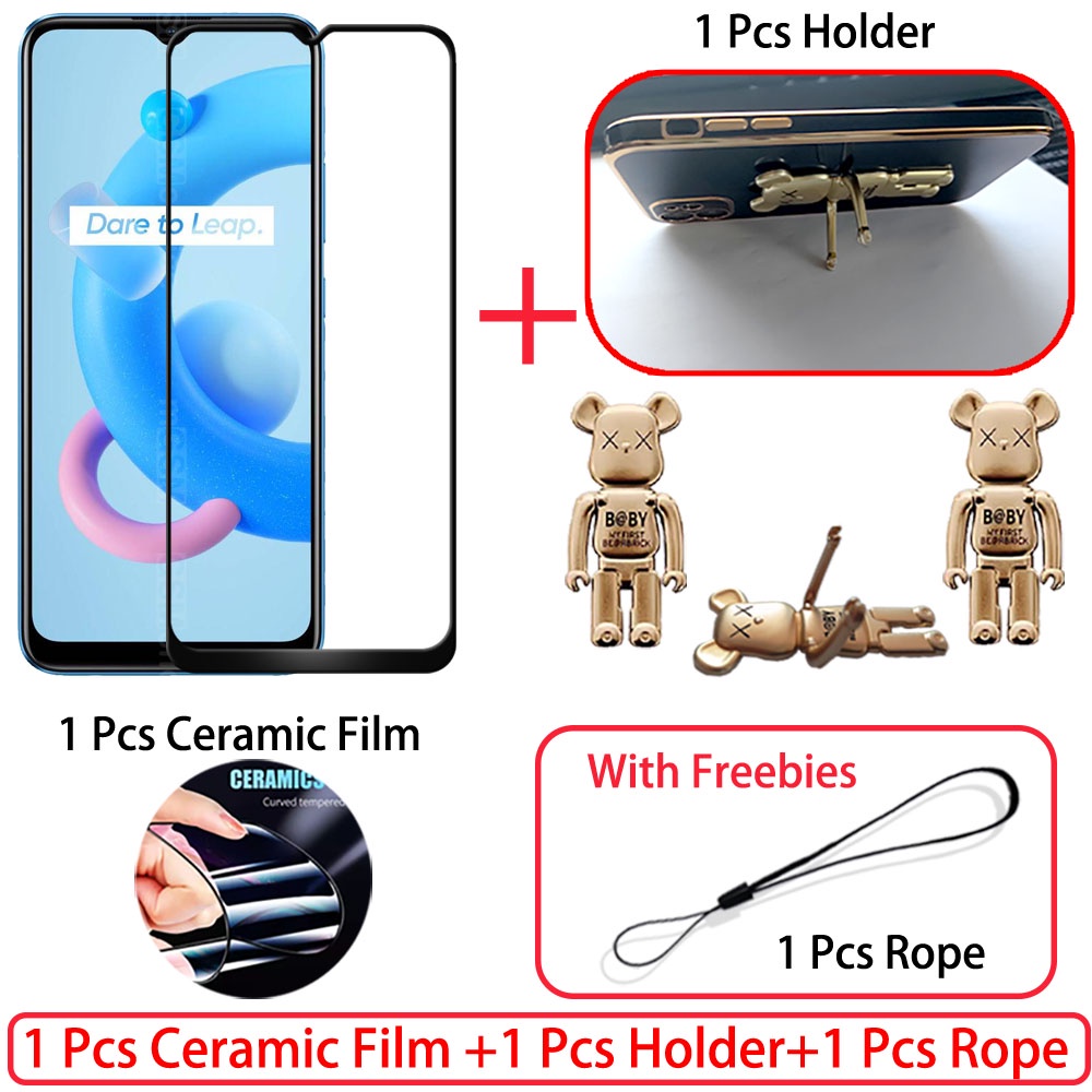 3 IN 1 For Infinix Smart 7 Infinix X6515 Case Luxury Electroplating Soft Phone Case with Ceramic Full Screen Film and Bear Holder and Silicone Lanyard