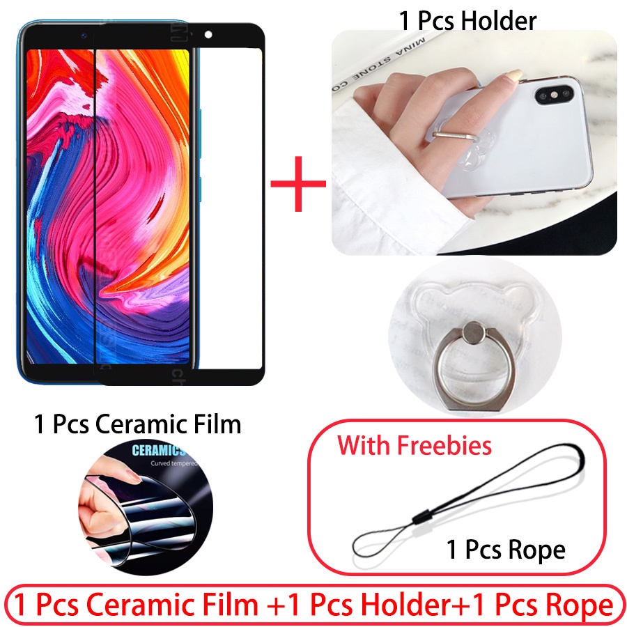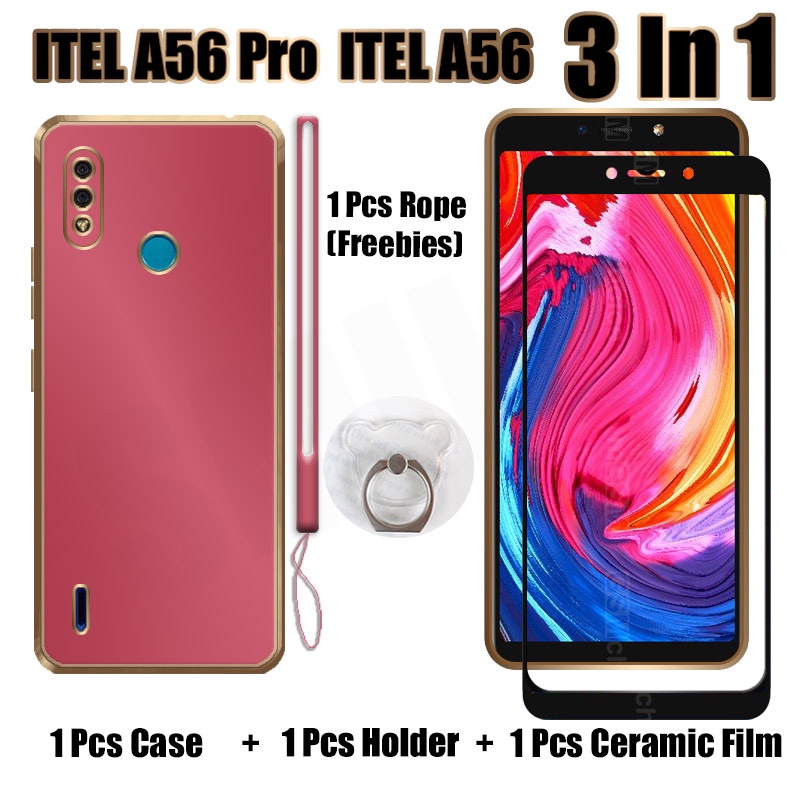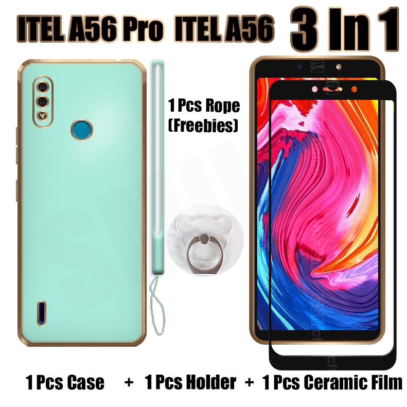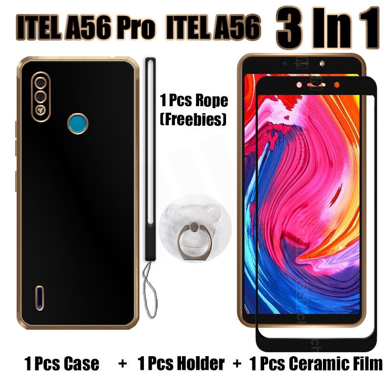 3 IN 1 ITEL A56 ITEL A56 Pro Case With Tempered Glass Curved Ceramic Screen Protector and Holder Silicone Soft Electroplated Lanyard Phone Case