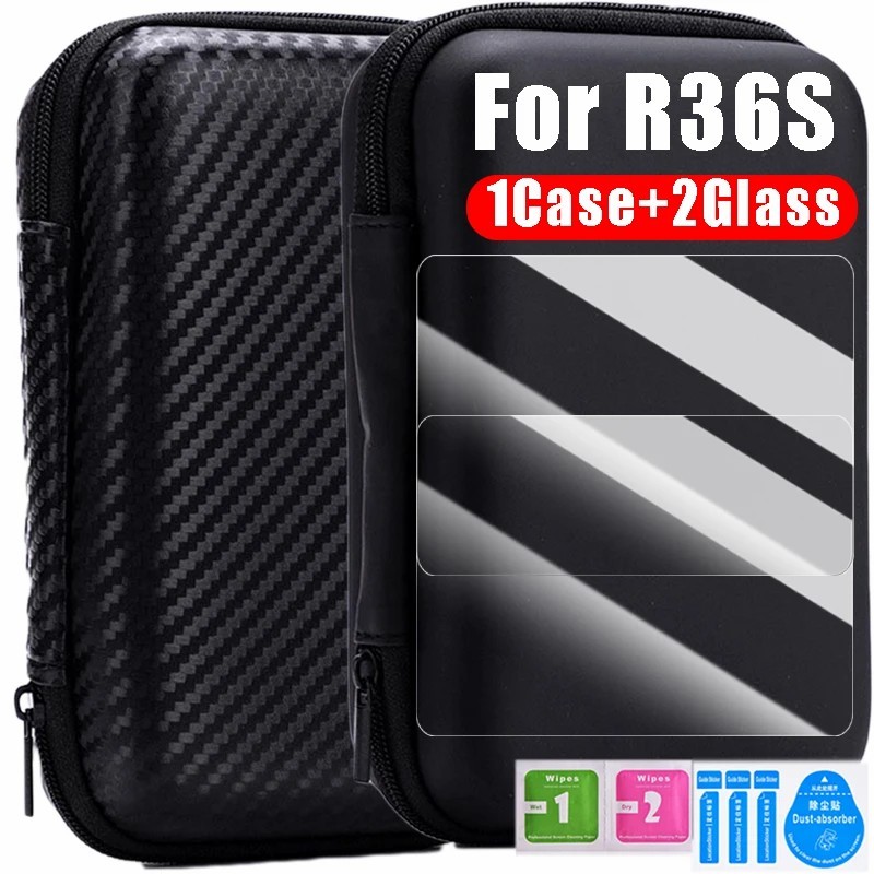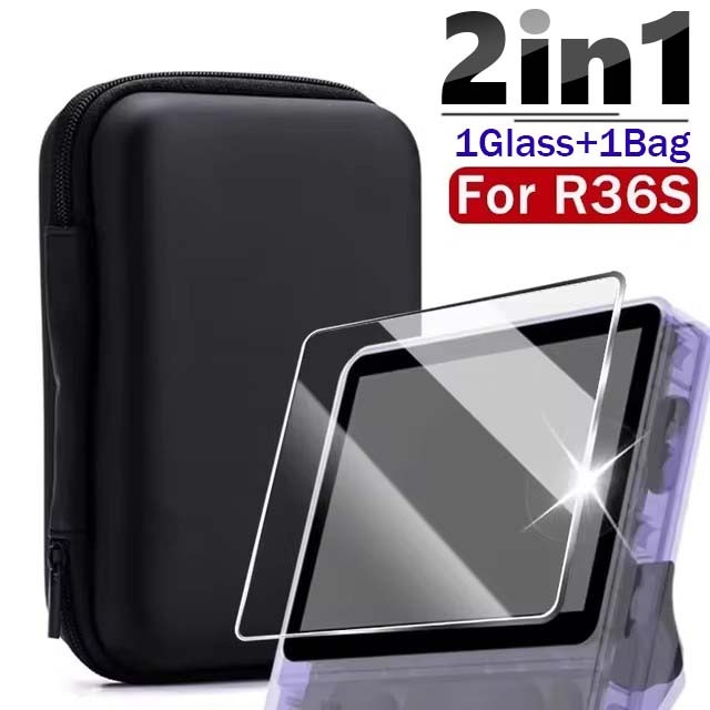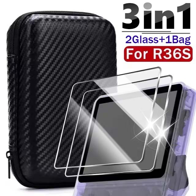 3 IN 1 Protective Set For R36S Game Console - EVA Protective Case - Portable Carrying Bag - Black Storage Bag - Tempered Glass Screen Protectors - Anti-Scratch, Shock-Proof