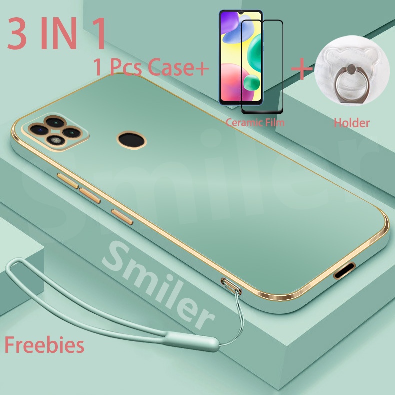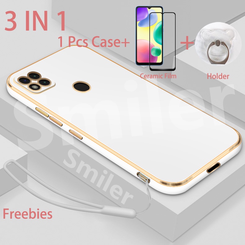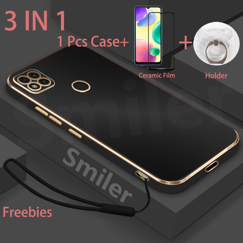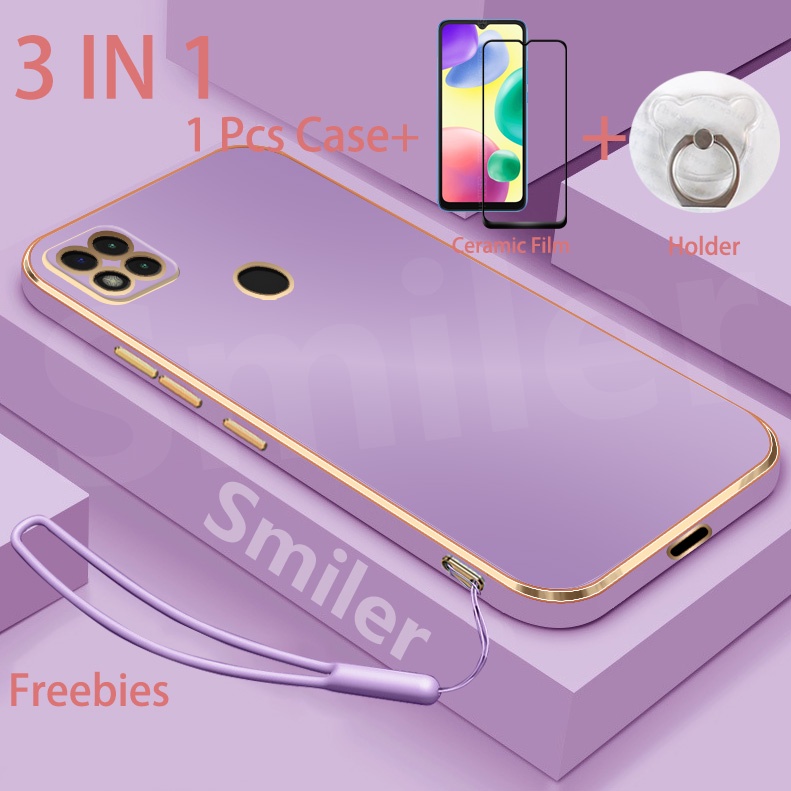 3 IN 1 Redmi 9C 10A Electroplated Straight Edge Case with Screen Protector and Phone Holder and Silicone Lanyard