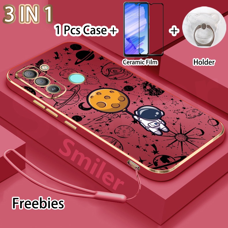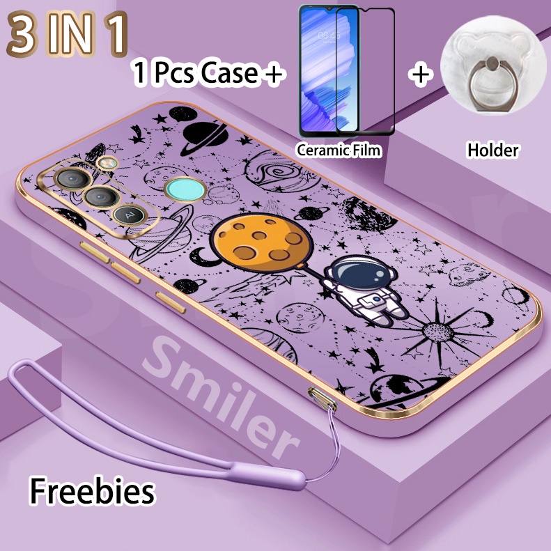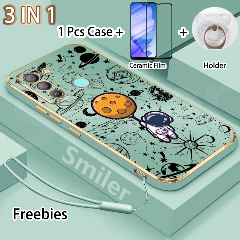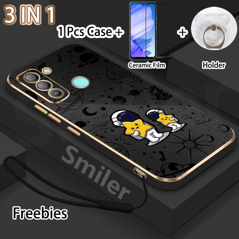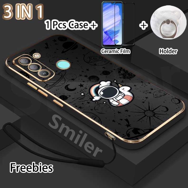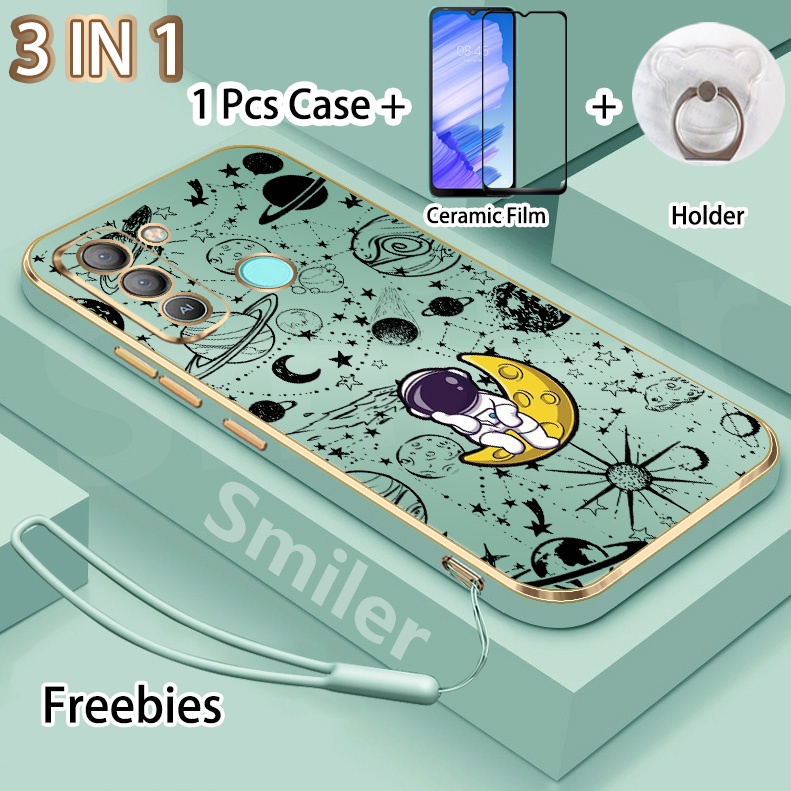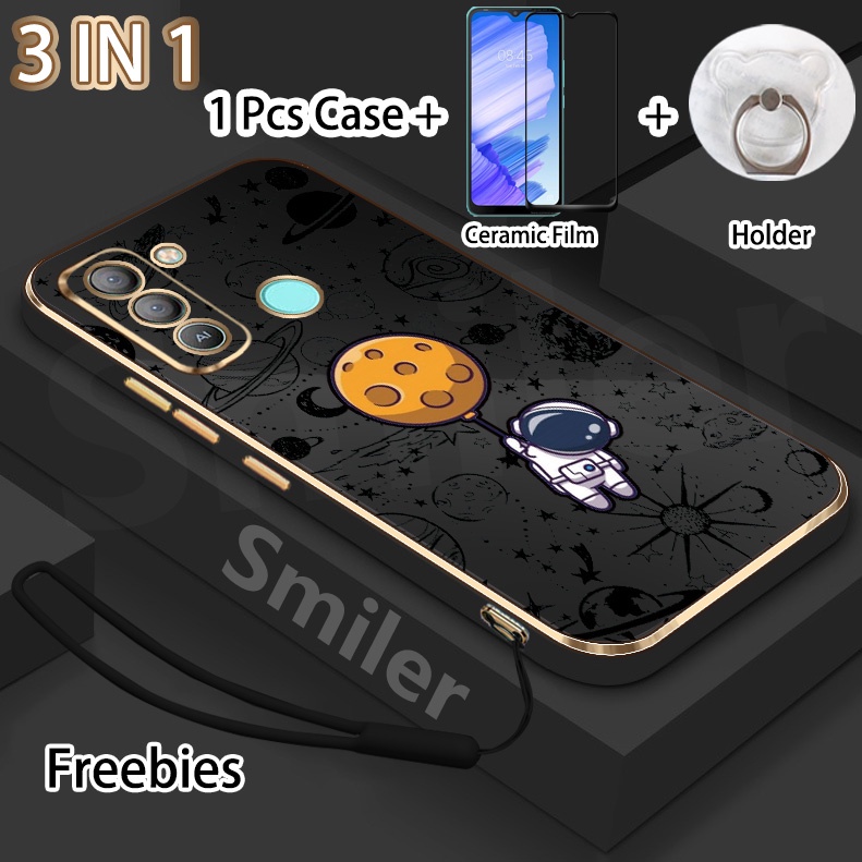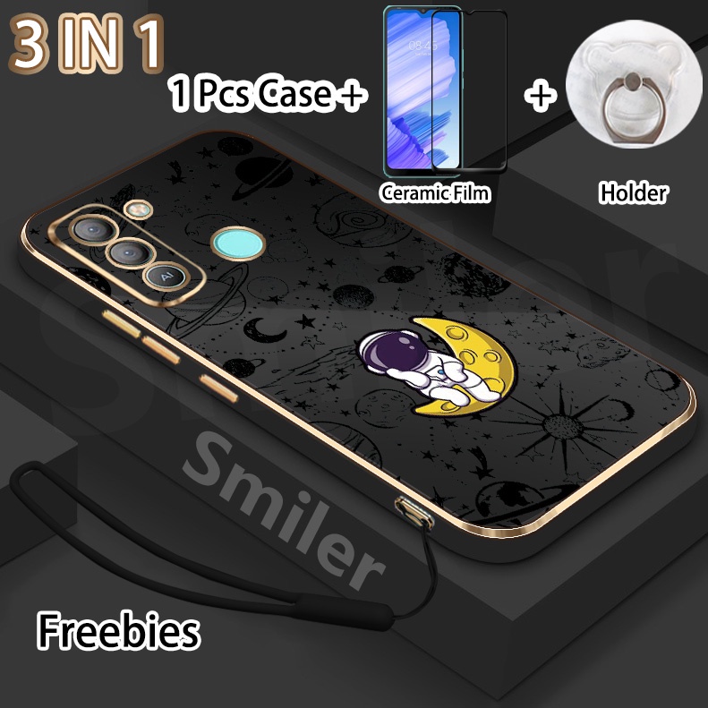 3 IN 1 Tecno Pop 5 LTE(BD4) Golden Electroplated Lanyard Phone Case With Tempered Glass Curved Ceramic Screen Protector and Holder Silicone Soft Printed NASA Case