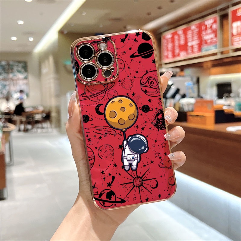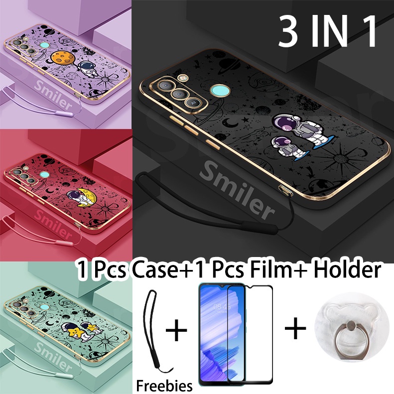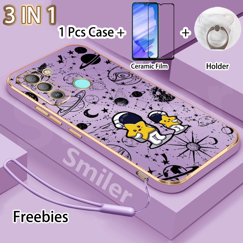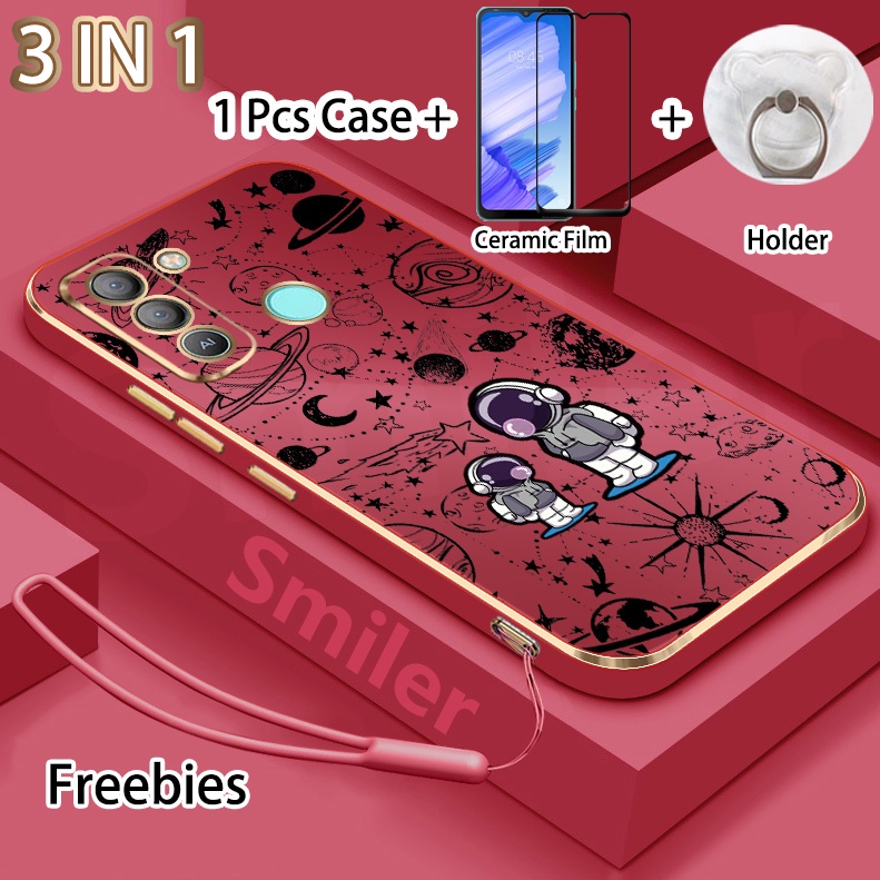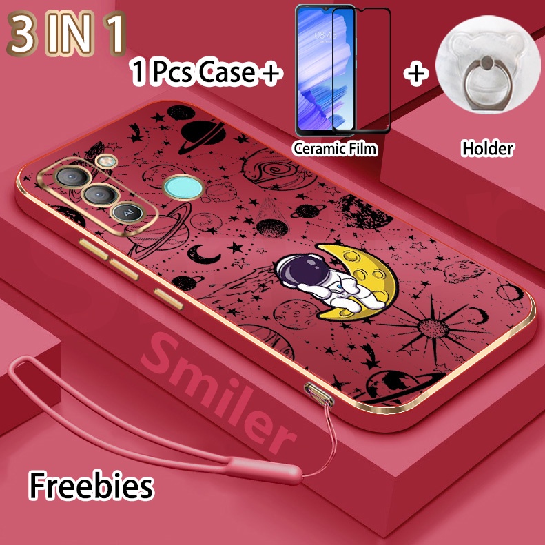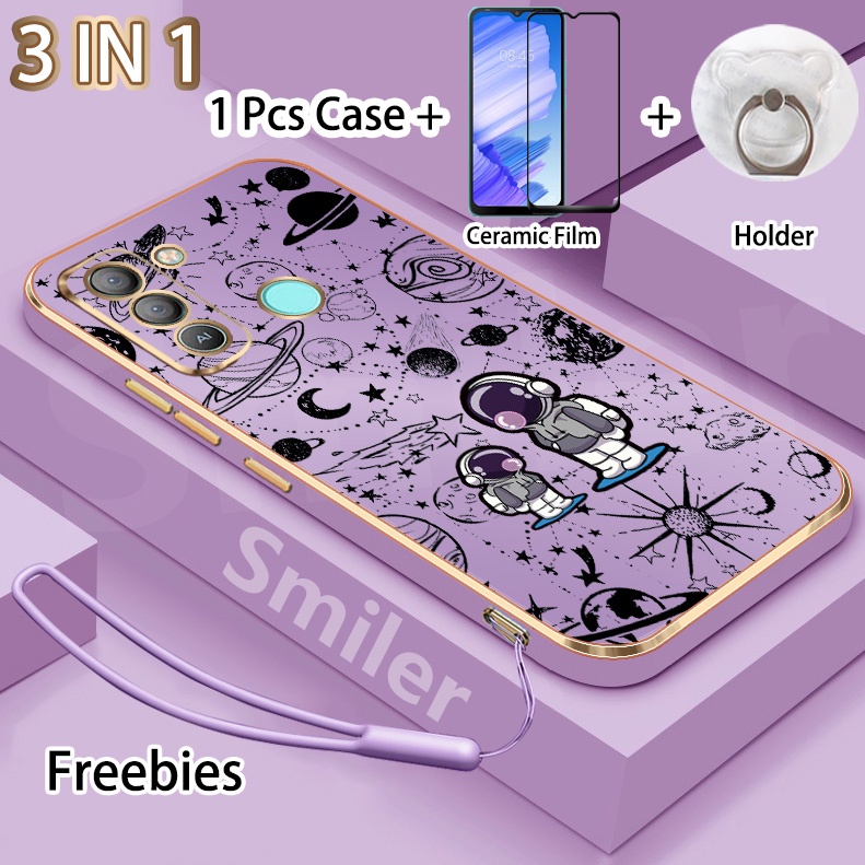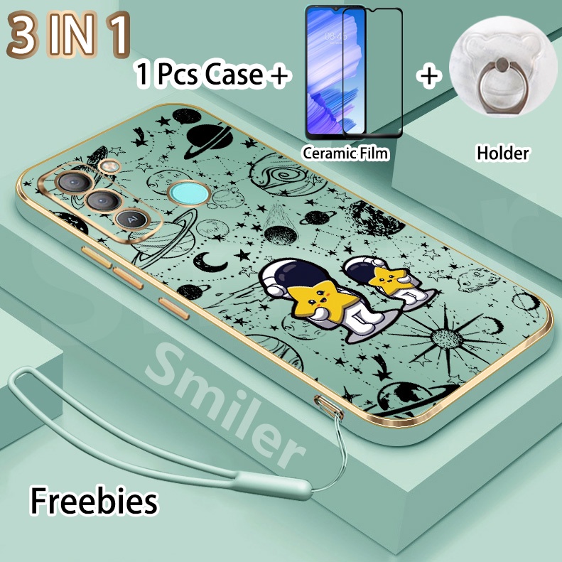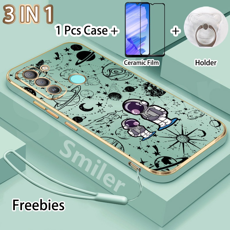 3 IN 1 Tecno Pop 5 LTE(BD4) Golden Electroplated Lanyard Phone Case With Tempered Glass Curved Ceramic Screen Protector and Holder Silicone Soft Printed NASA Case