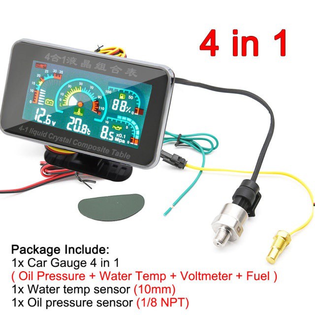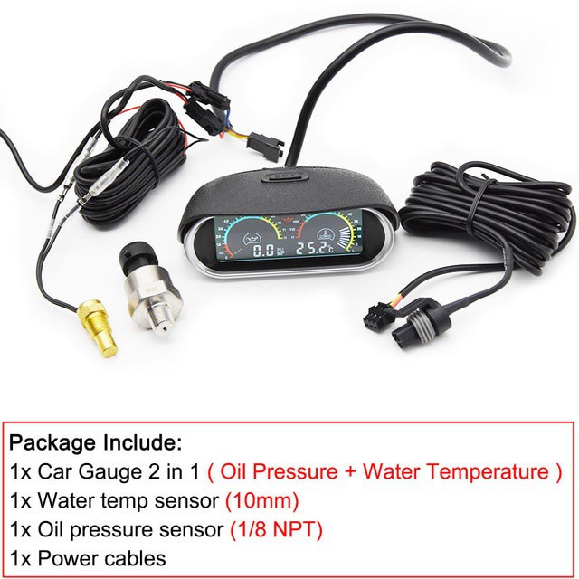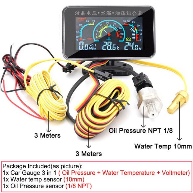 3 In 1 LCD Car Digital oil pressure gauge Voltmeter Water Temp meter 1/8 NPT Oil Pressure sensor + Water Temperature sensor 10mm