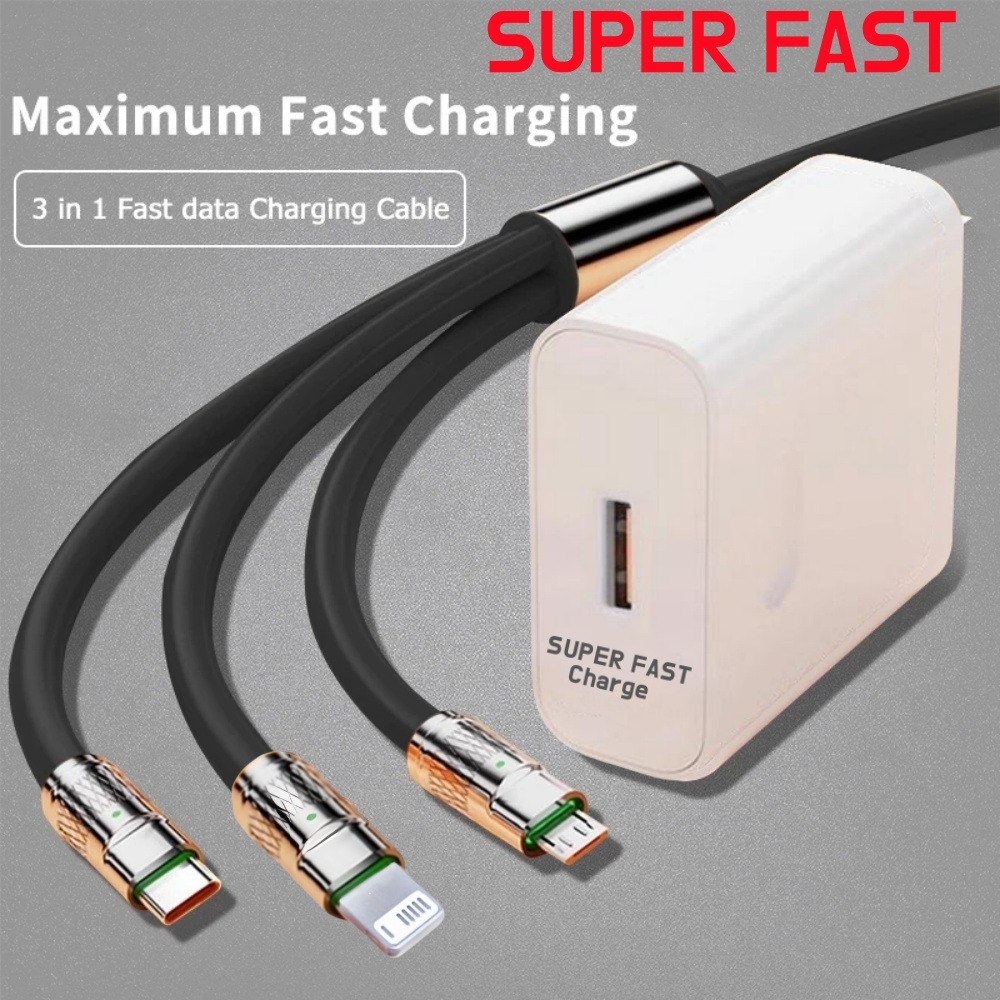 3 In1 Fast Charger For Android Type-C Micro USB iOS 6A Cable Silicone Material Cable With Super Fast Charging Adaptor Cellphone Connector Fast Charging