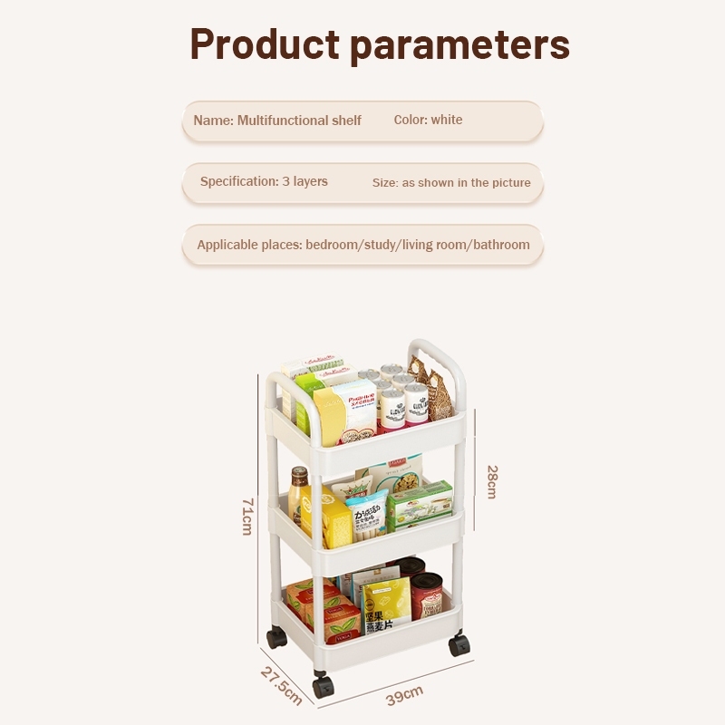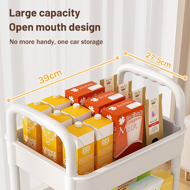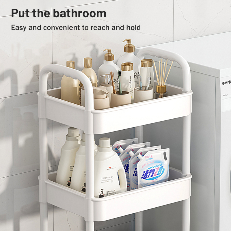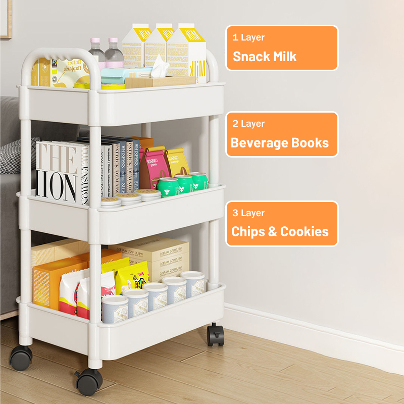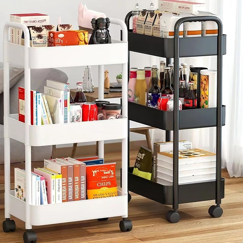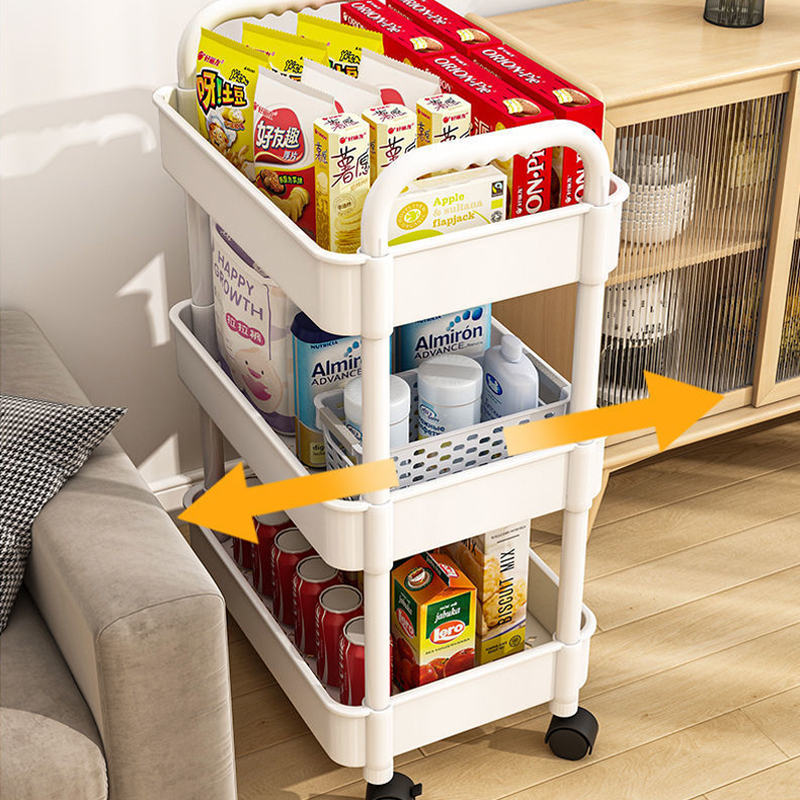 3 Tier Plastic Trolley Trolley Organizer with Handle Wheels and 3 Hanging Baskets