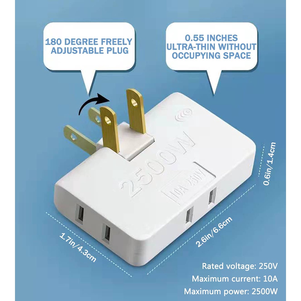 3 in 1 Extension Plug 3 Way Wall Outlet Extender AC Adapter 2-Prong