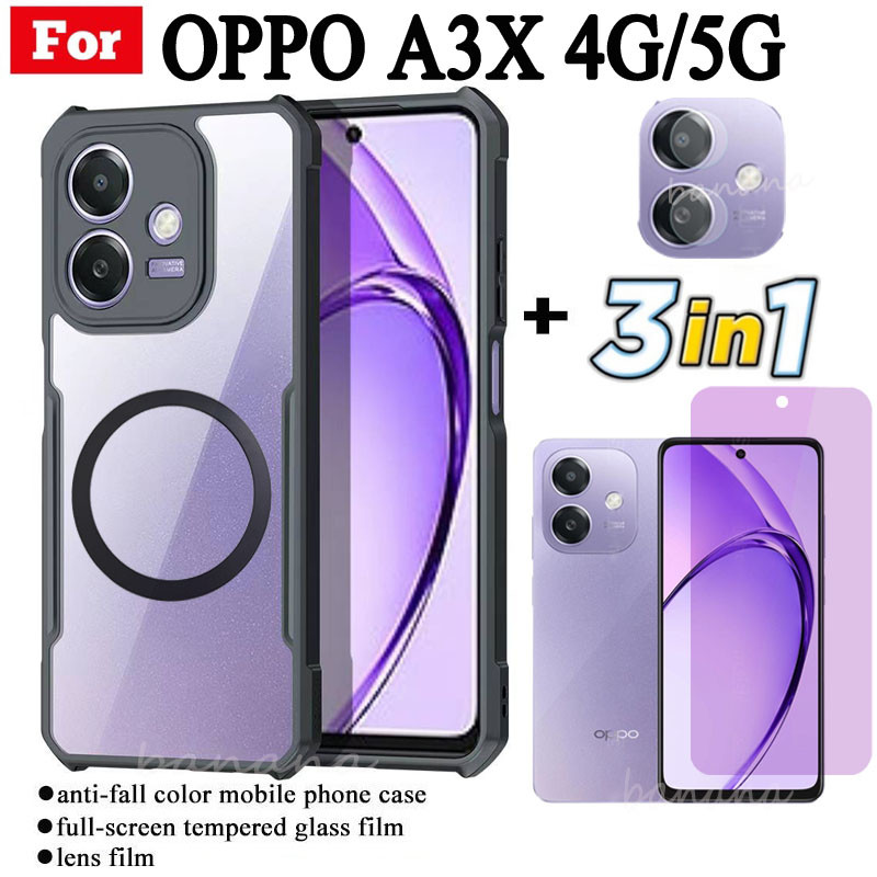 3 in 1 OPPO A3X Shockproof Phone Case With Magnetic Wireless Charging Sticker For OPPO A60 A3 Pro Anti Spy Privacy Full Coverage Tempered Glass Screen Protector and Lens Film
