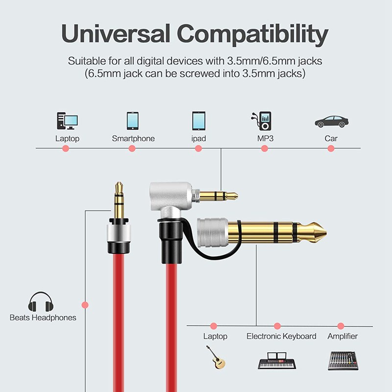 3.5mm to 6.5mm Stereo Audio Aux Cable Replacement For Monster Pro Solo Detox Mixr Headphone