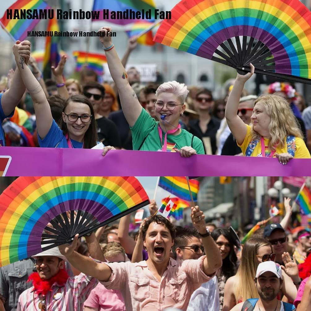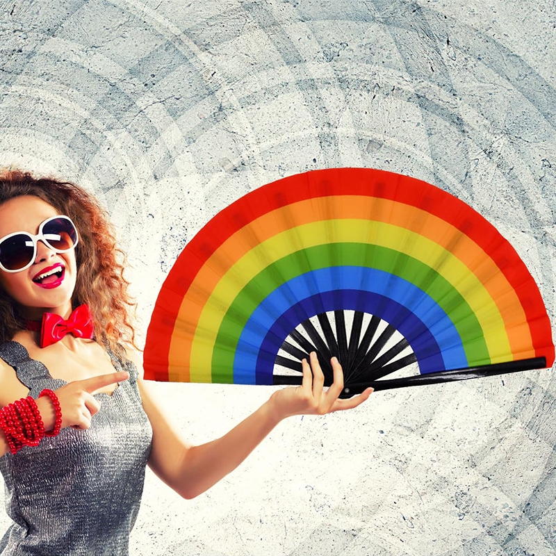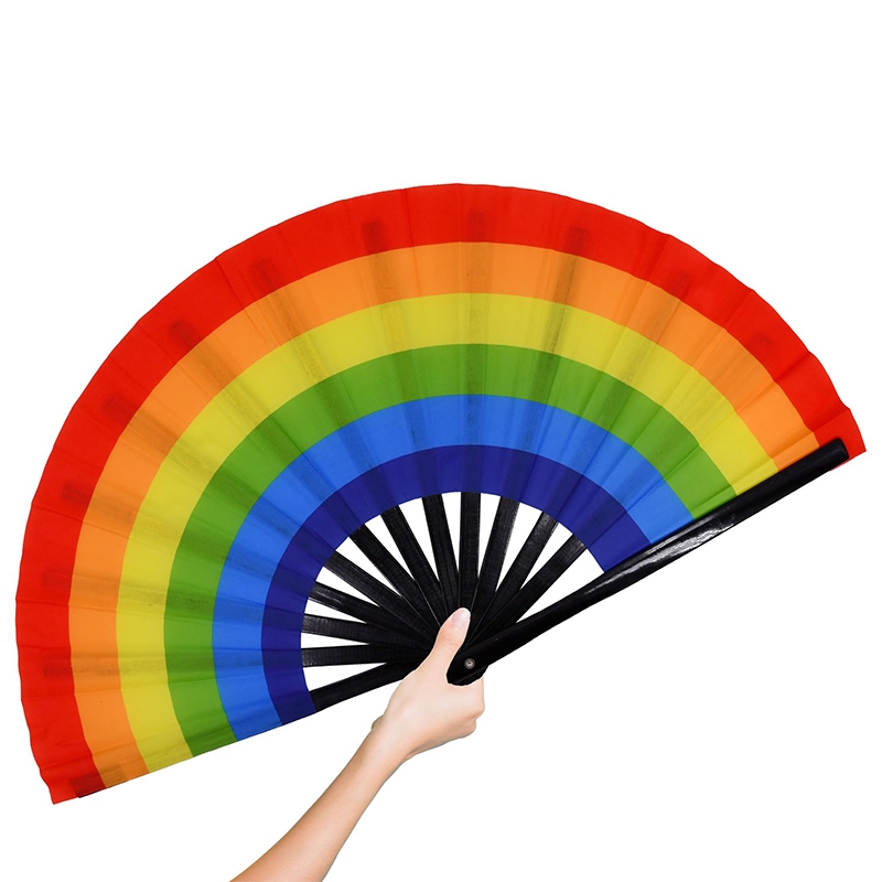 33cm Large Rainbow Folding Hand Rave Fan Bamboo Nylon-Cloth Handheld Fan Rainbow Party Decoration