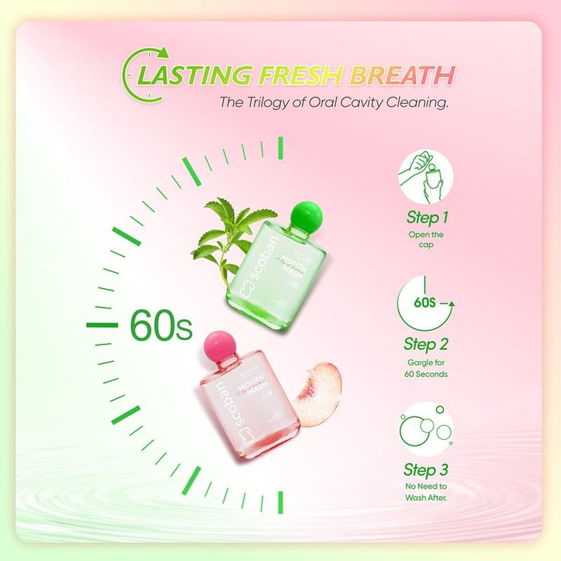 Scoban Fresh Mouthwash 220ml Mouth Perfume Mint Peach Flavor Alcohol Free Teeth Cleaning LongLasting