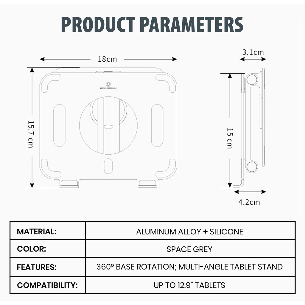 360 Rotation Aluminum Tablet Stand Multi-Angle Foldable Tablet Holder for 12.9" Tablets - 2 COLORS