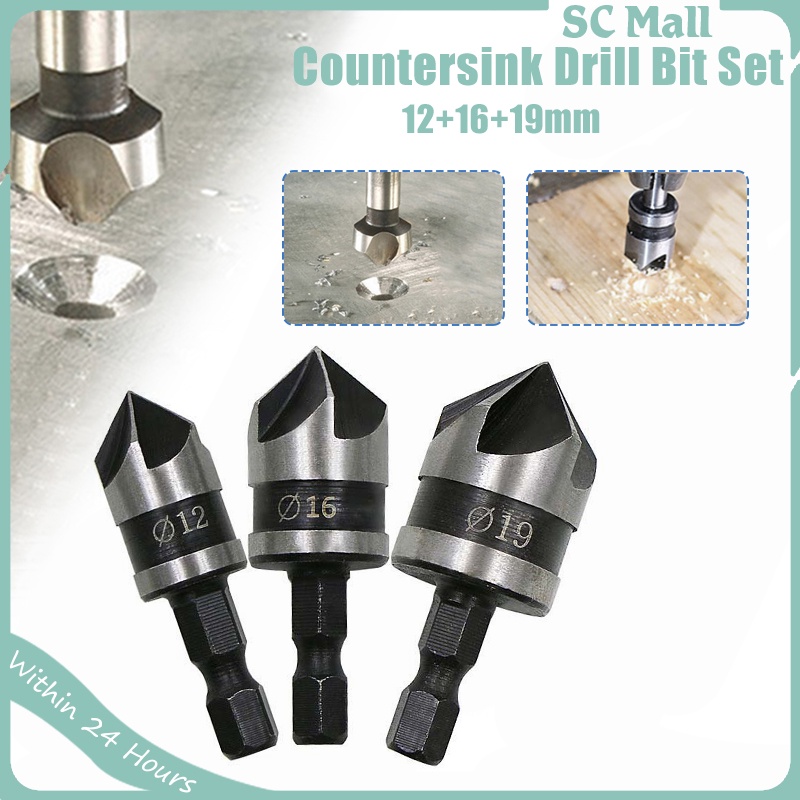 3PCS Countersink Drill Bits Center Punch Set 12/16/19mm Hex Shank 5 Flute Center Punch Tool