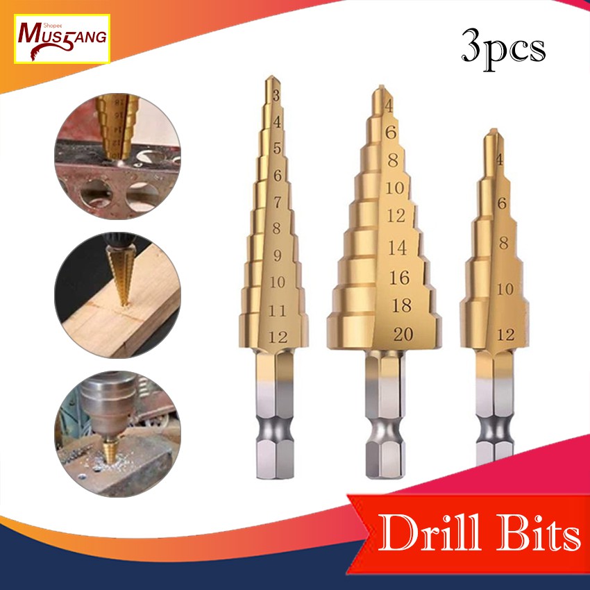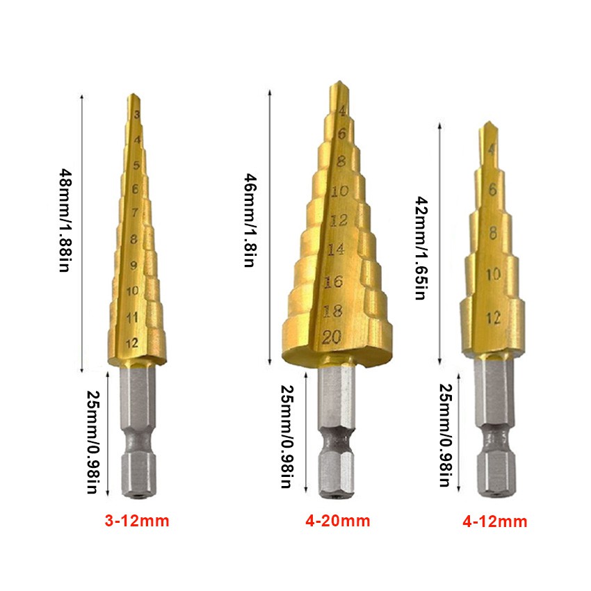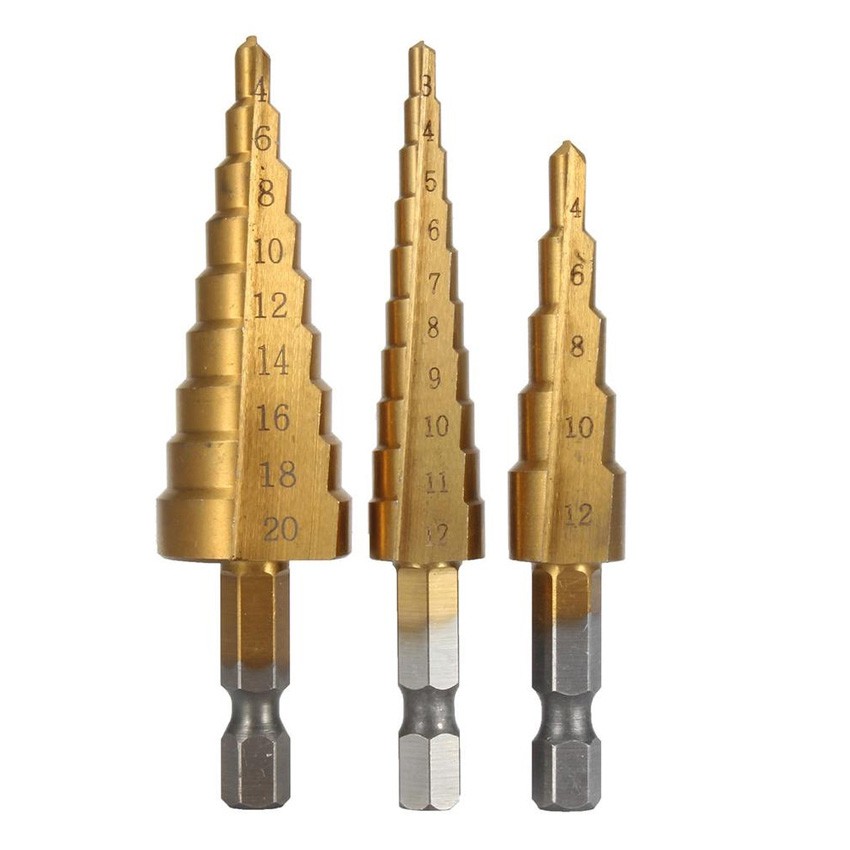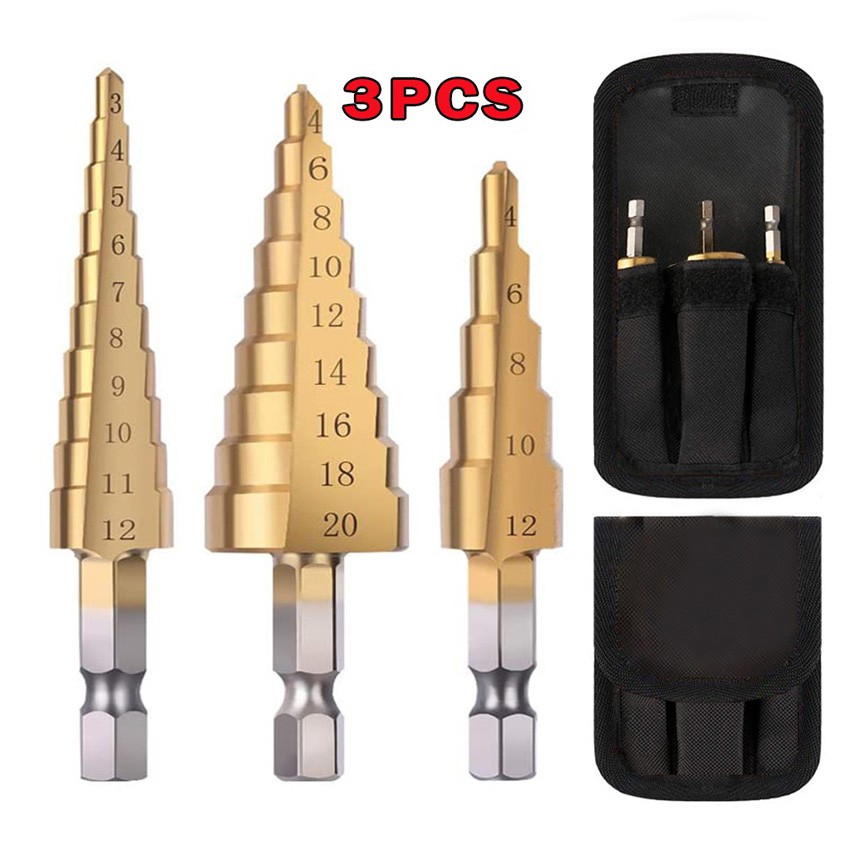 3pcs HSS Titanium Step Drill Bit Set Cone Hole Cutter Taper Metric Titanium Coated Metal Hex Core