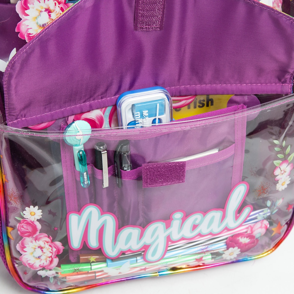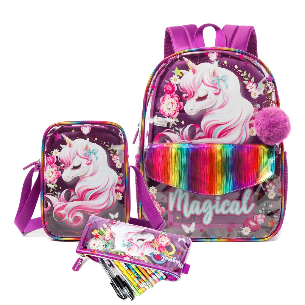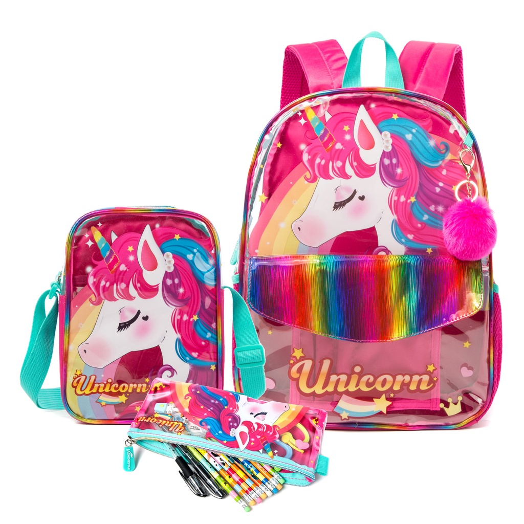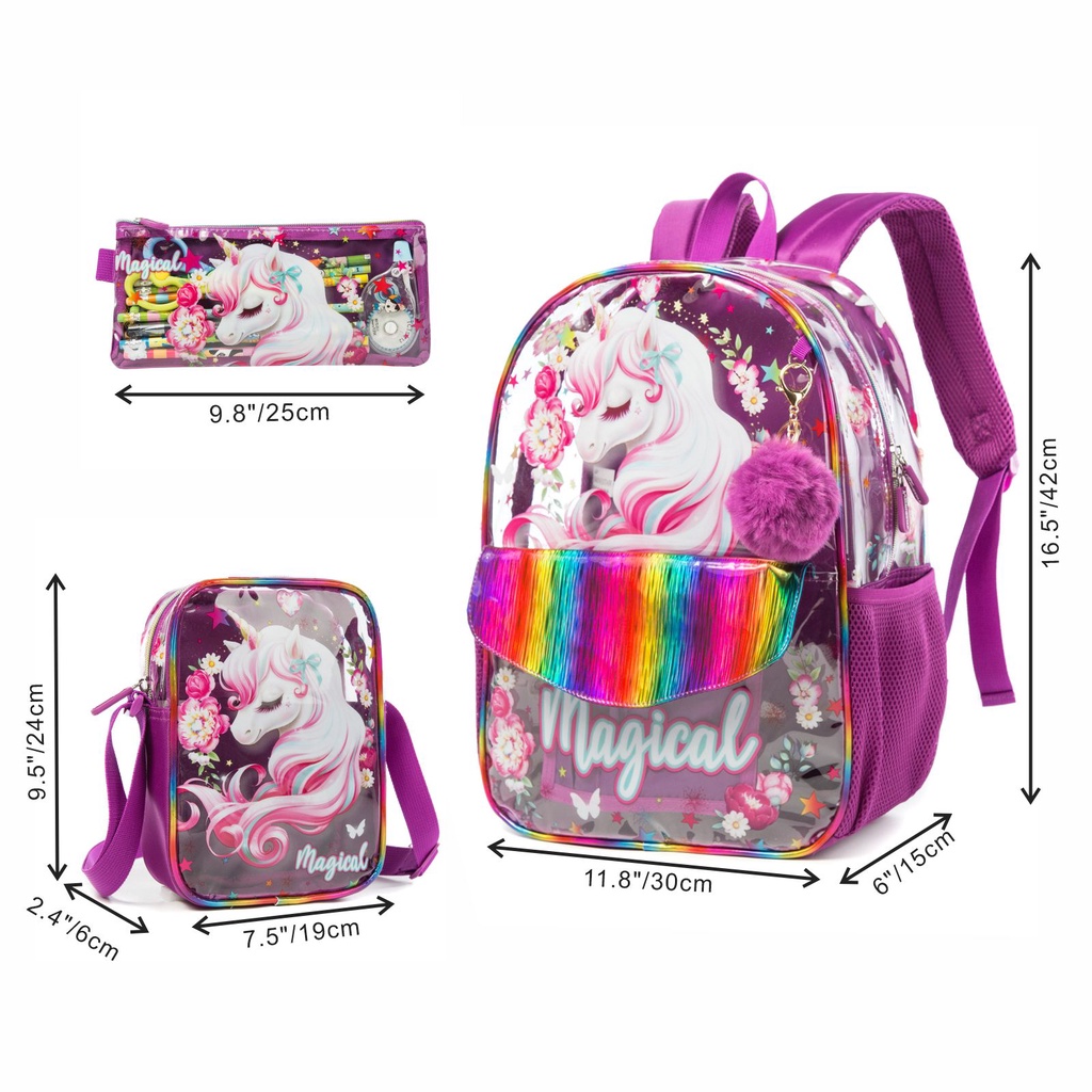 3pcs/set 16.5" Kids Girls PVC School Bag Grades1-3-6 (Backpack+Lunch Bag+Pen Case)Transparent Daypack Bookbag