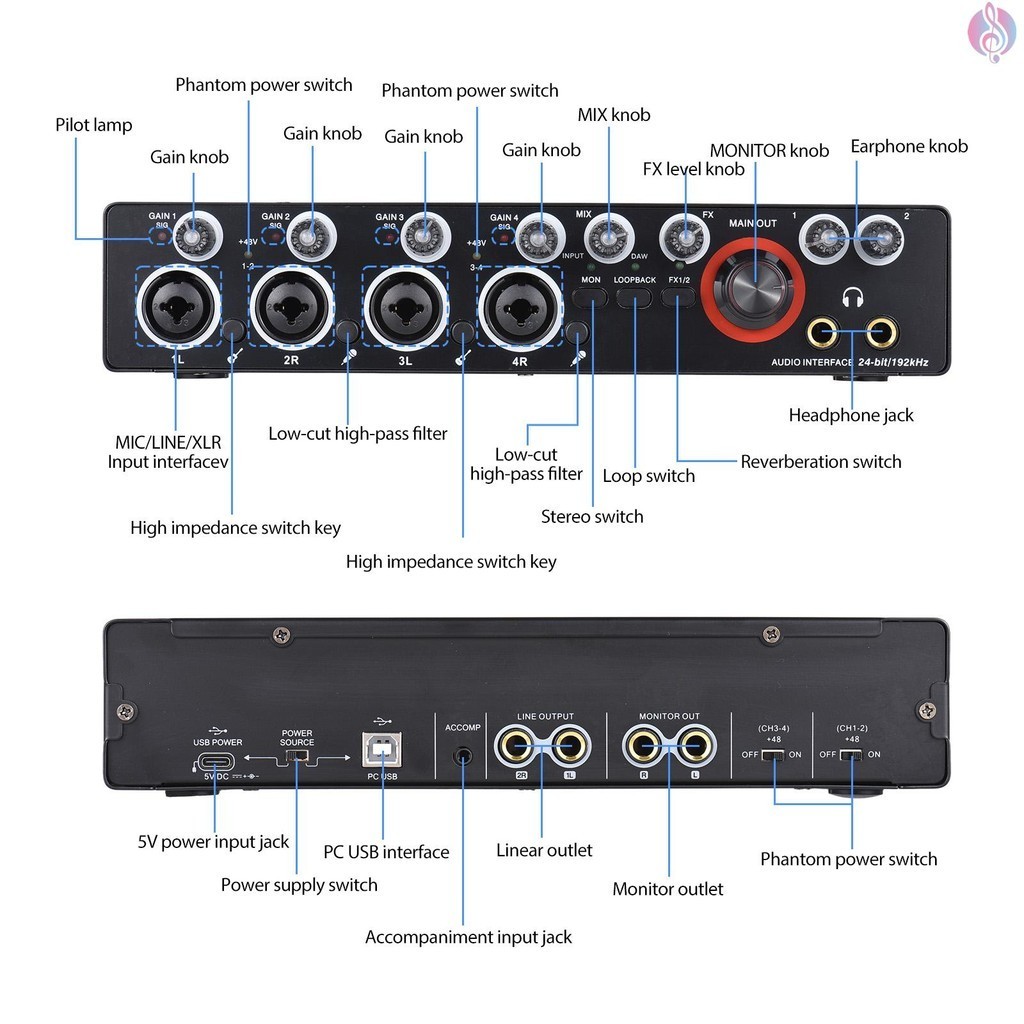 4 Channels Recording Sound Card with Driver Free Audio Interface, 4-in 4-out USB Sound Card 24 bit/192khz 48V Phantom Power Supply for Professional Recording of Live Streaming Kara