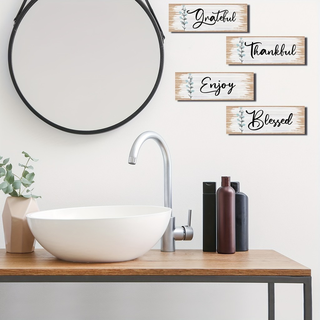 4 Pack Home Wall Decor Signs, Living Room Hanging Decor Signs with Quotes Gratitude/Thank You/Blessings/Enjoy, Flower Wall Art Signs for Living Room Bedroom Farmhouse Decor