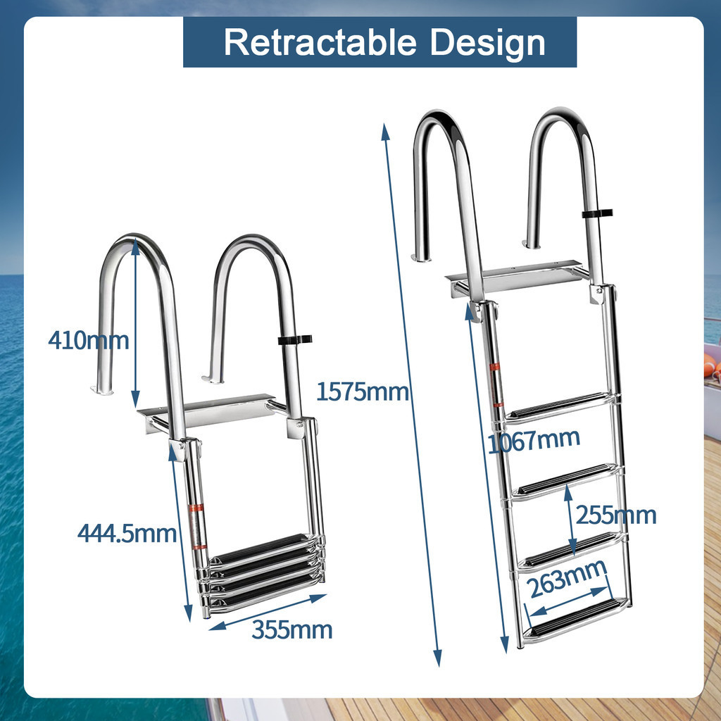 4 Steps Marine Boat Ladder Stainless Steel Folding Rear Entry Telescopic Ladder with Wide Steps Ladder with Pedal Hand Railing 200kg Capacity for Sailboats,Ships,Swimming Pools