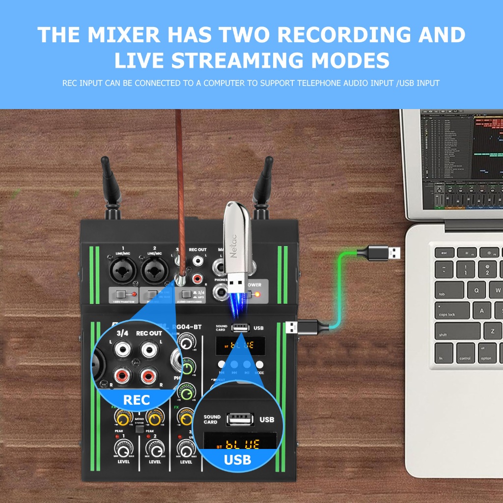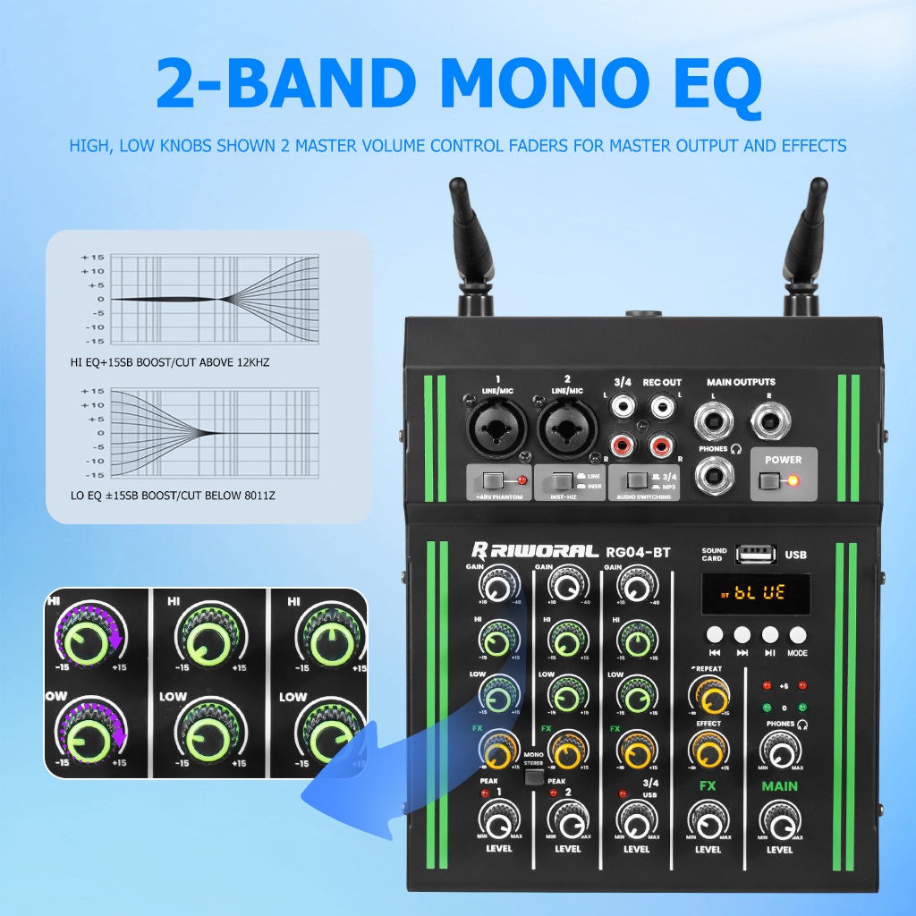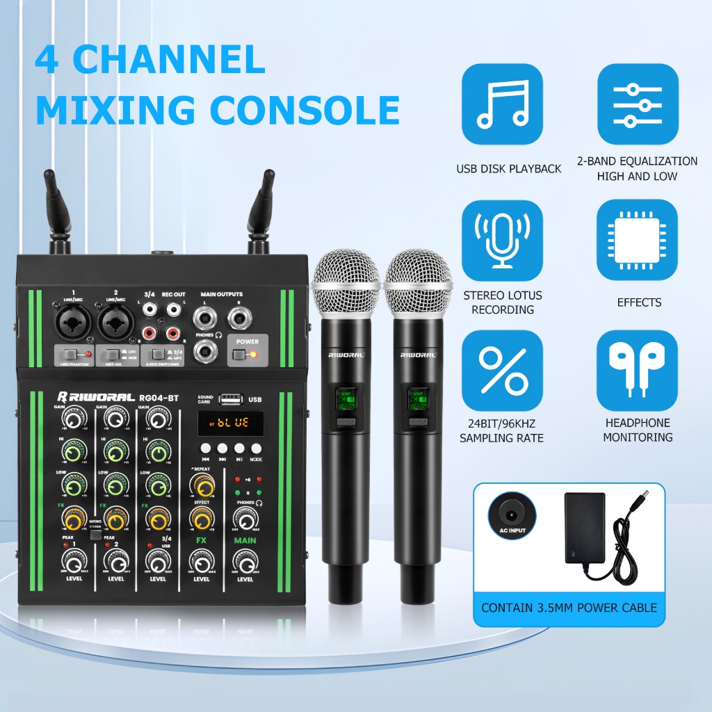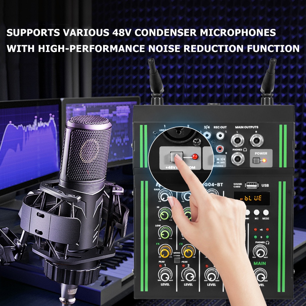 4 channel mixer wireless dual microphone 2 band equalizer bluetooth USB mixer audio +48v power