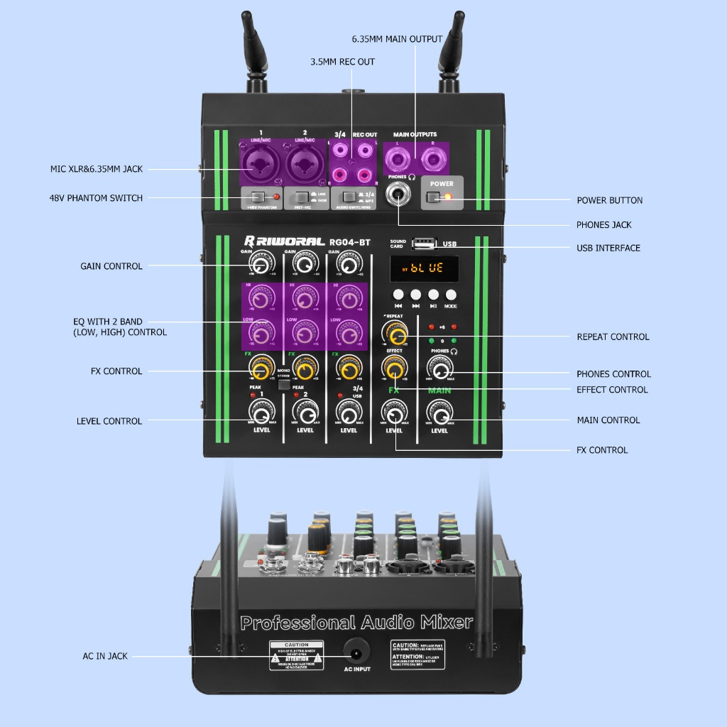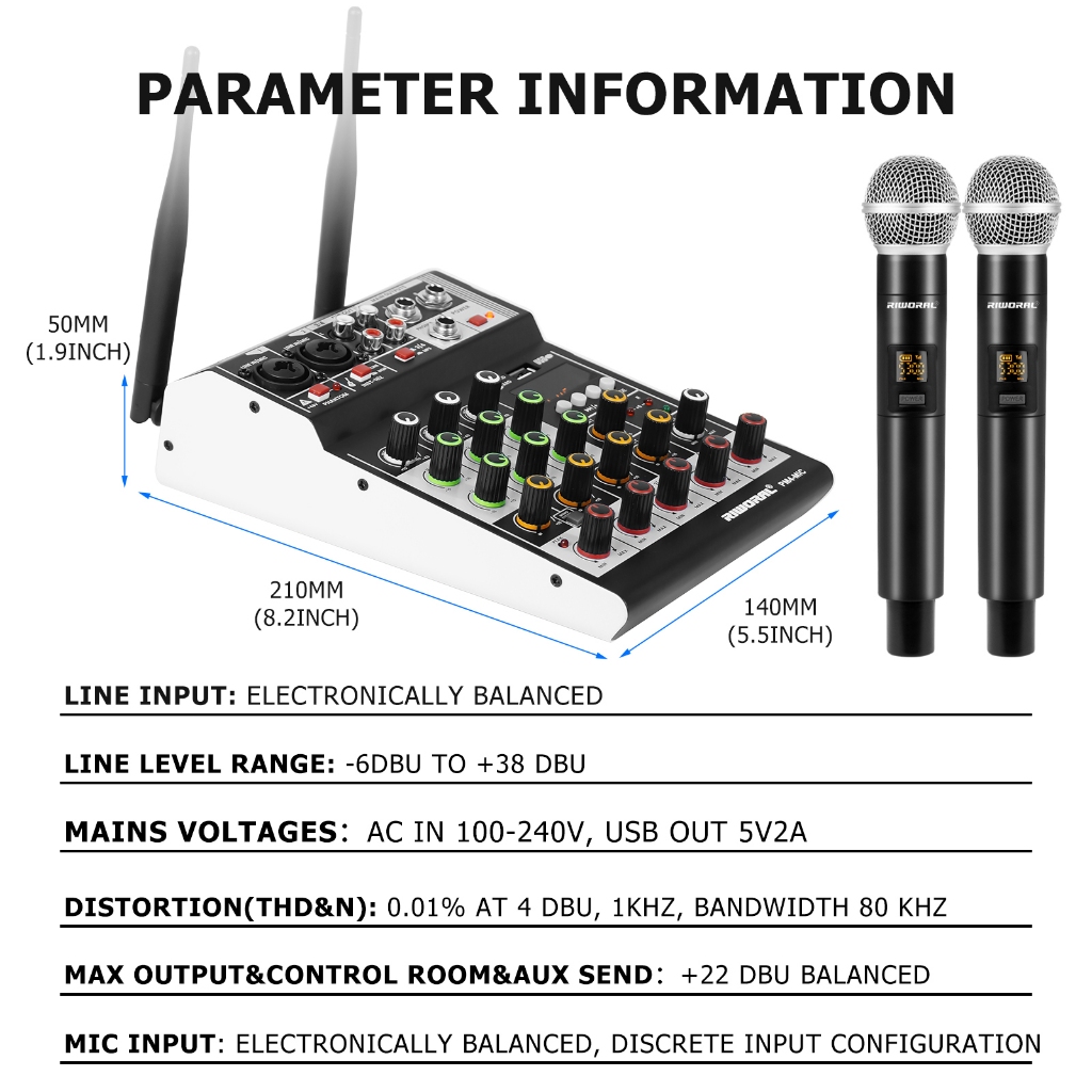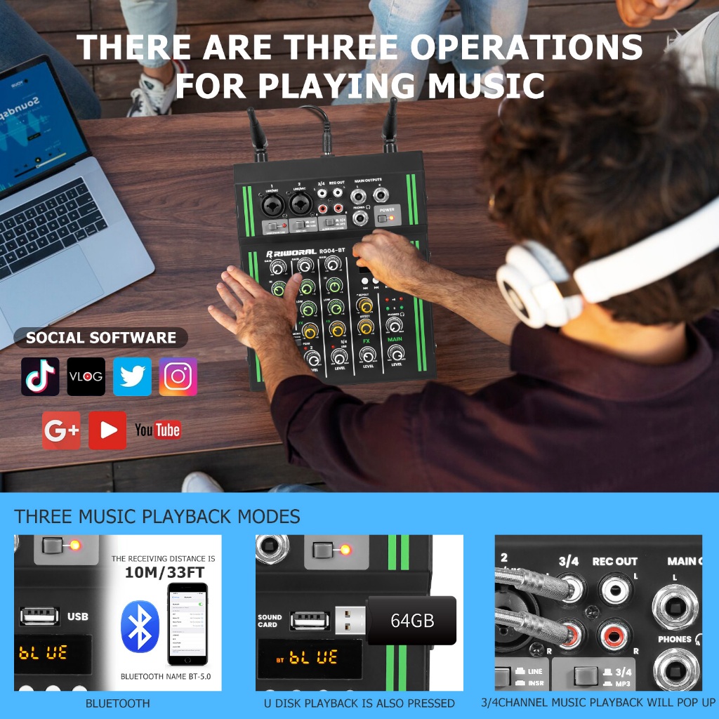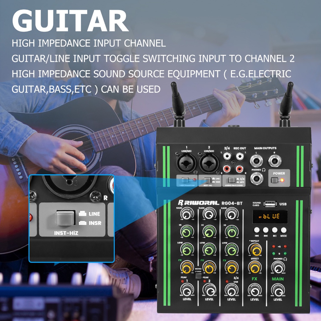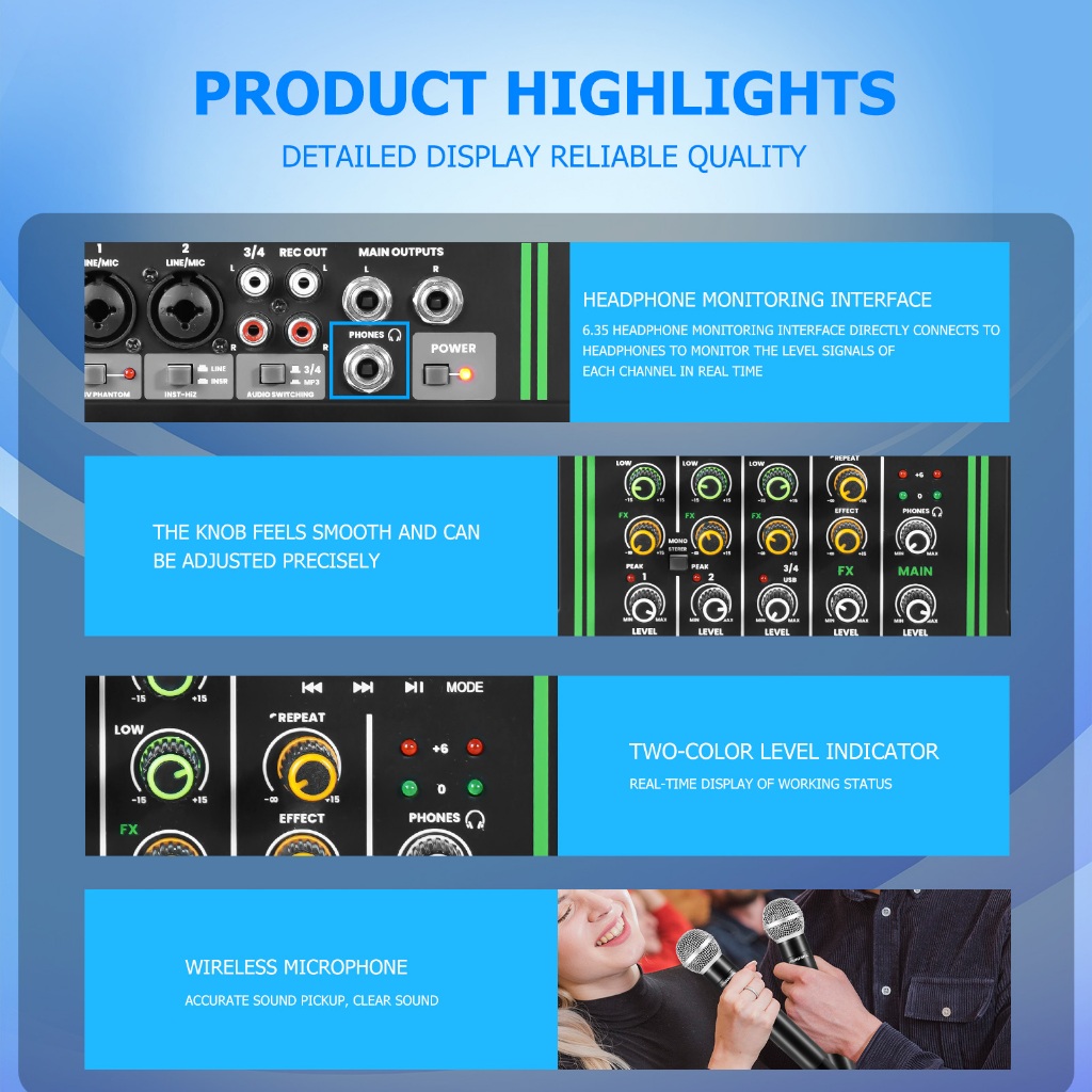 4 channel mixer wireless dual microphone 2 band equalizer bluetooth USB mixer audio +48v power