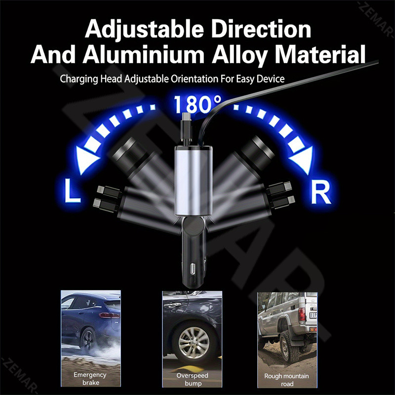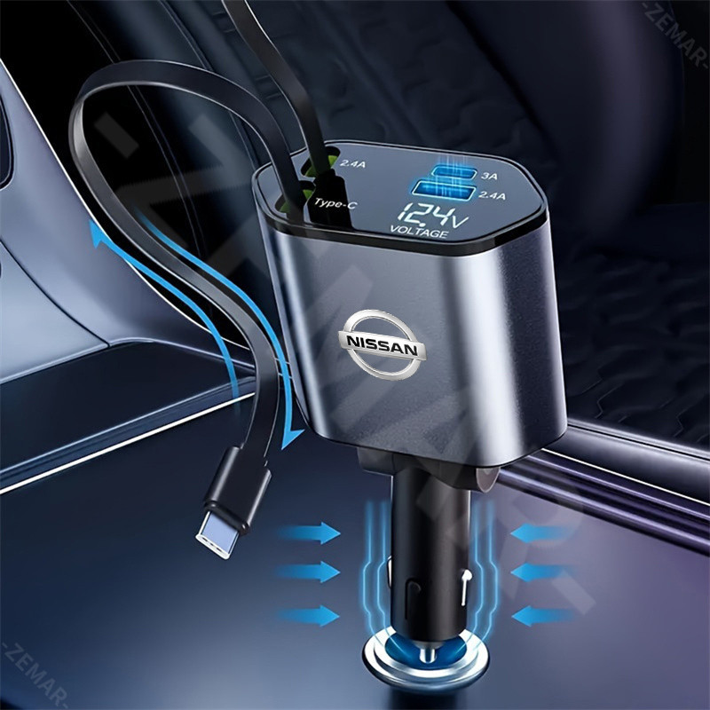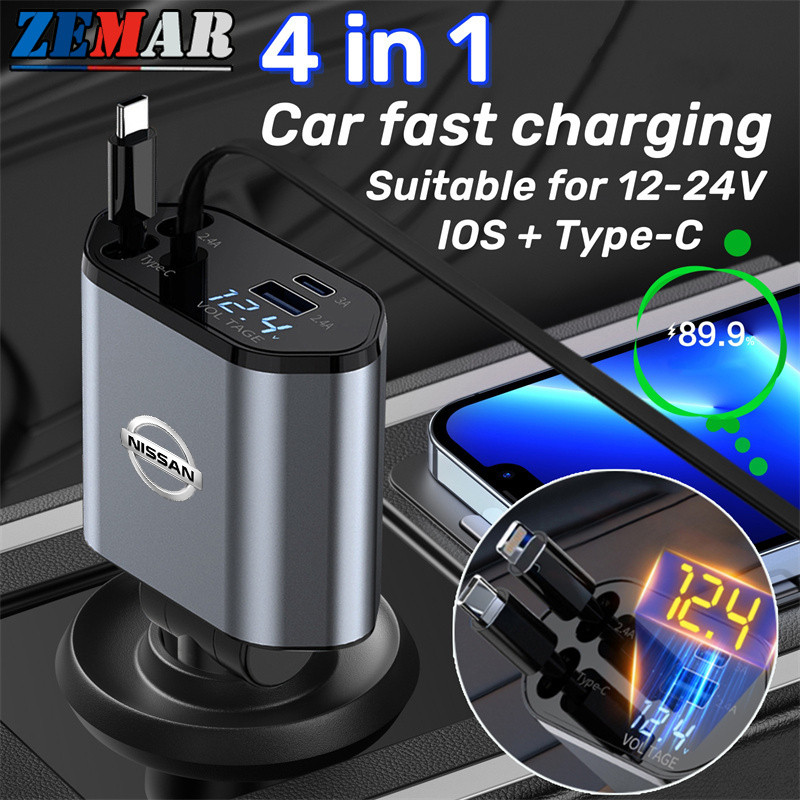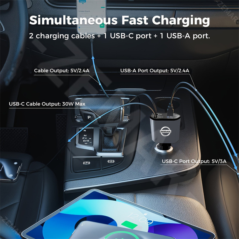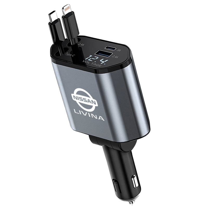 4 in 1 Nissan Car Charger Super Fast Charging Universal USB Type-C IOS Adapte Charger Telescopic Line Adjustable Direction for Nissan Navara Almera Livina Kicks e-power NV350 Sentra Terra Leaf Patrol Titan GTR