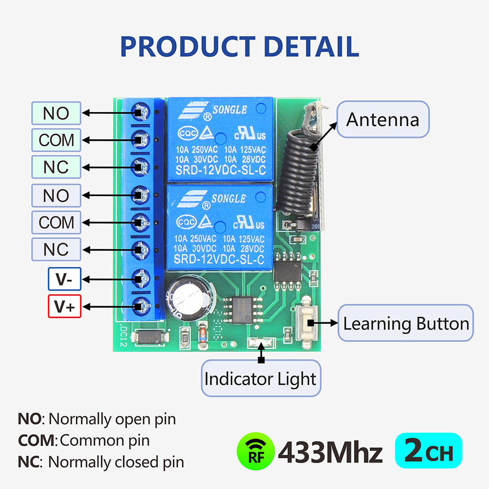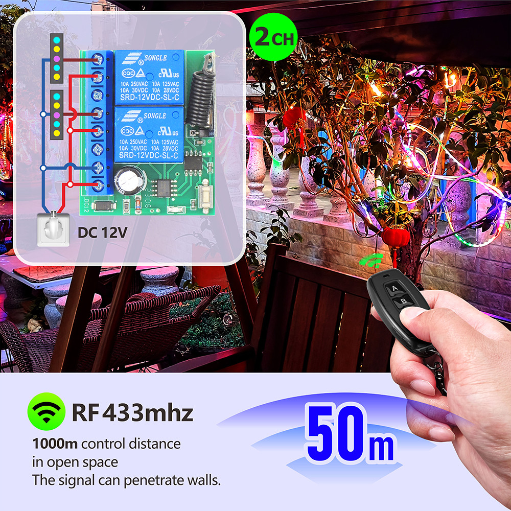 433MHz Universal Wireless Remote Control Switch DC 12V 2 CH Motor Light Relay Switch 50m Control Range,for Light/Gate/Motor/DIY