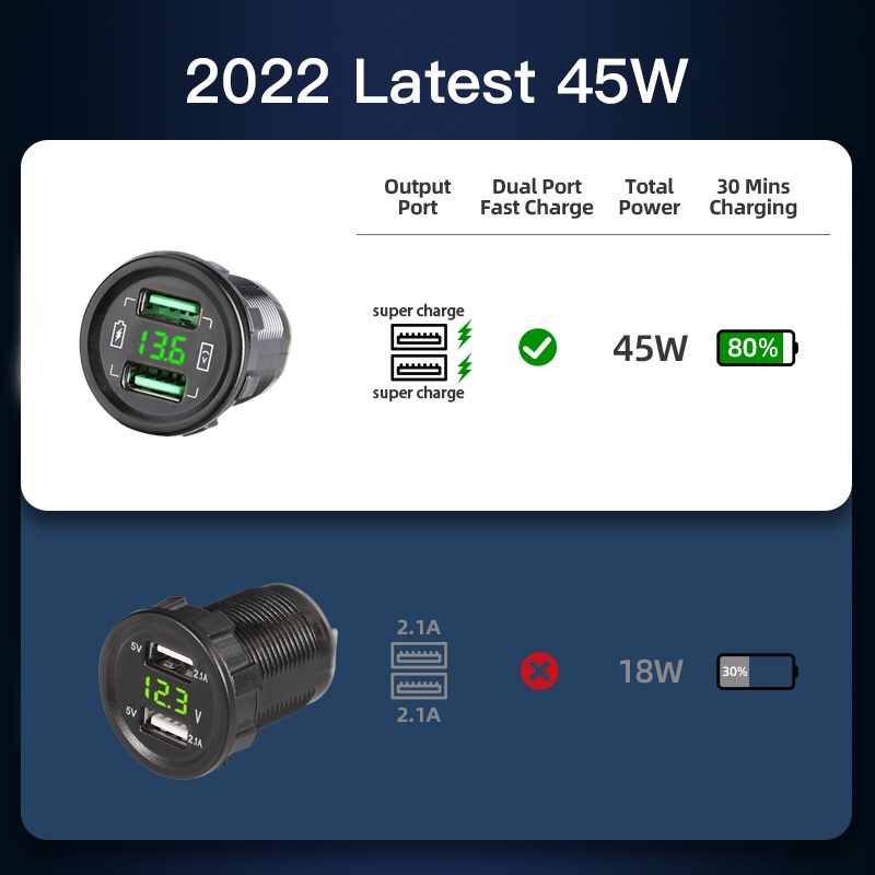 45W Super Fast Charging Aluminum Dual USB Car Charger with Voltmeter for 12V power outlet Adapter Motorcycle ATV Boat Marine RV