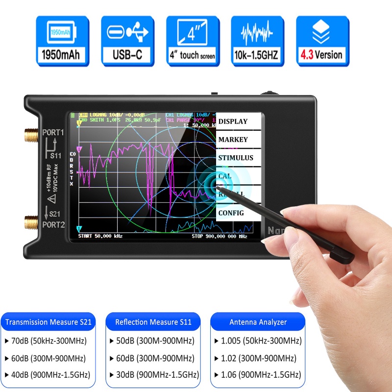 4inch 10k-1.5GHz Nano VNA-H4 Vector Network Analyzer HF VHF UHF Antenna Analyzer Tester V4.3