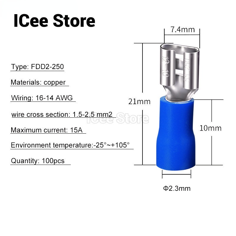 50Pcs FDD Terminal FDD2-250 2.8mm 4.8mm 6.3mm Female Insulated Electrical Crimp Terminal for 1.5-2.5mm2 Cable Connectors Cable Connector