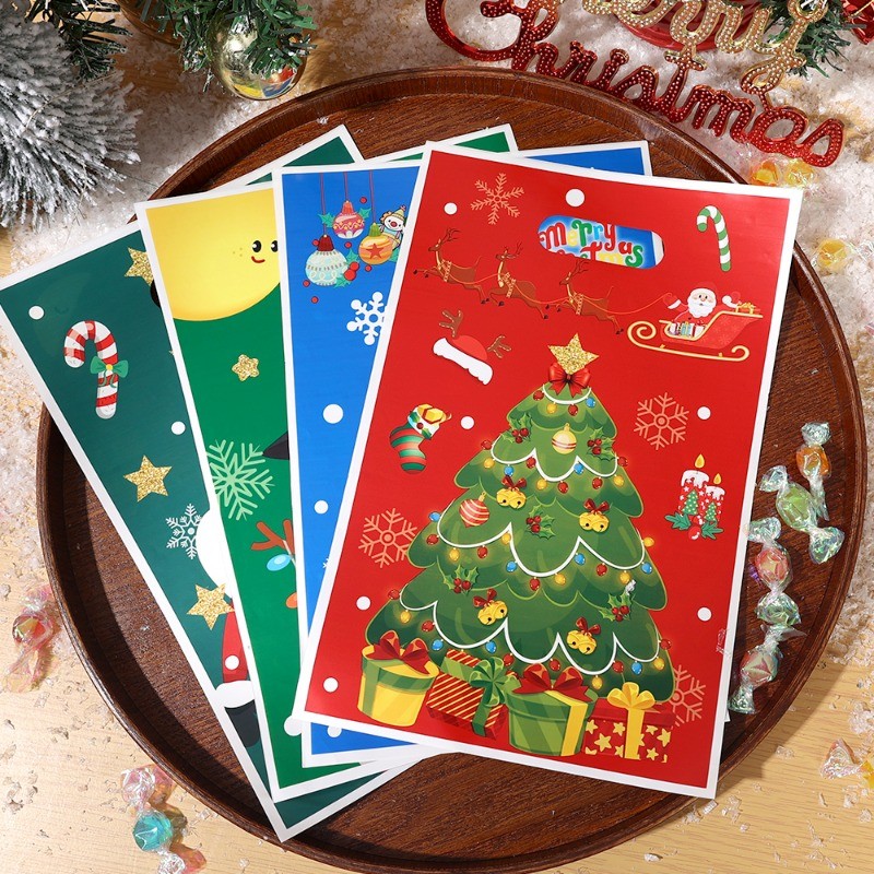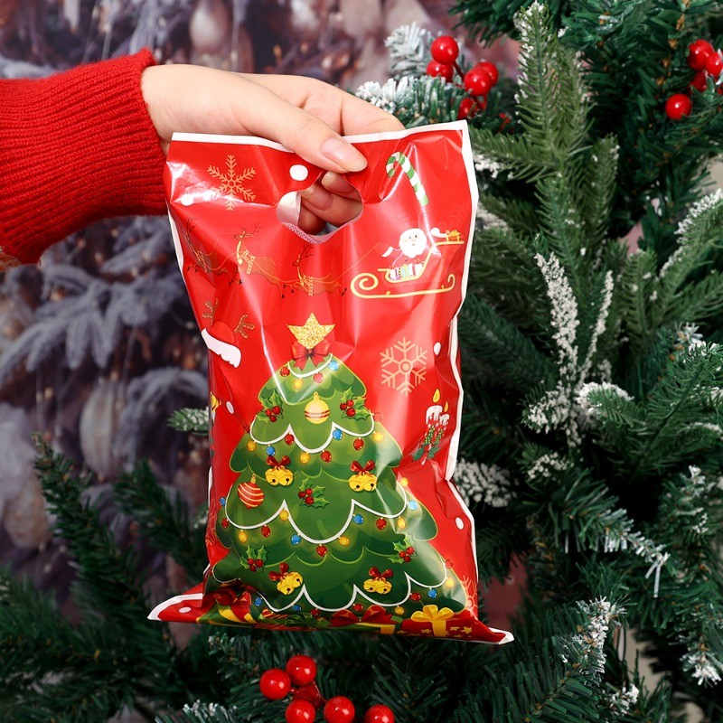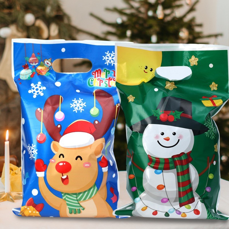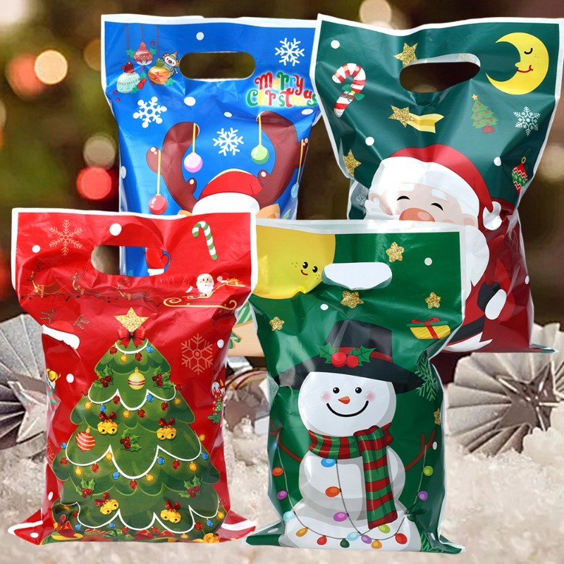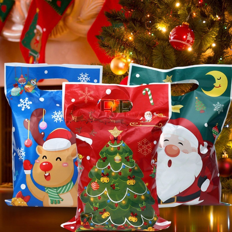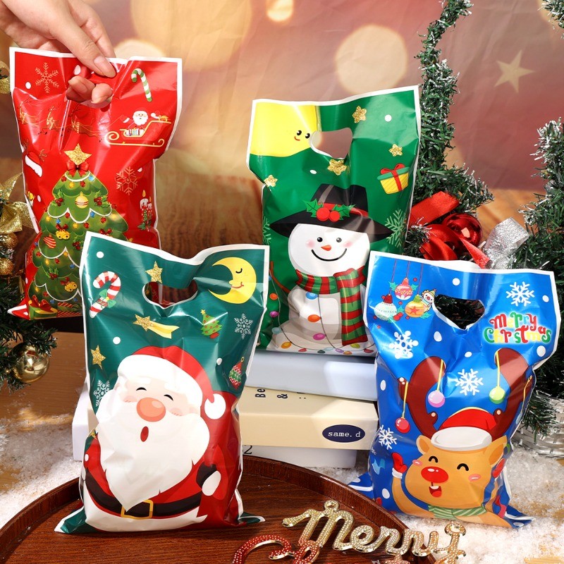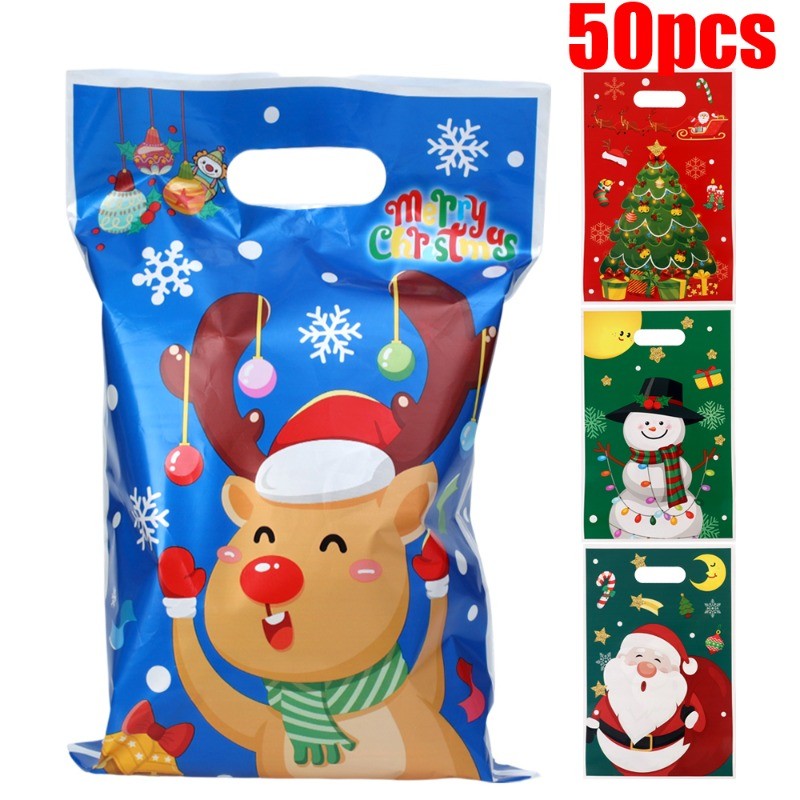 50Pcs/Set Merry Christmas Plastic Gift Bags - Cartoon Santa Claus Snowman Printed Handbags - Xmas Winter Holiday Party Favors Bags