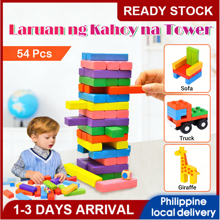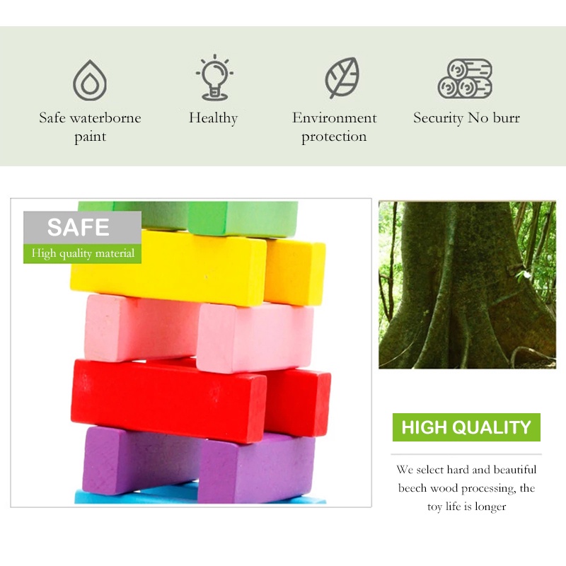 54 Pcs Wooden Toy Building Blocks Stacking Tumbling Tower Rainbow Wooden Domino Blocks