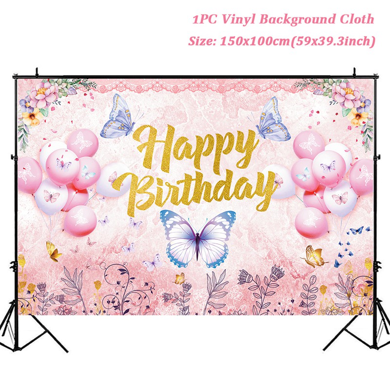 59*39.3'' Ins Butterfly Style Happy Birthday Backdrop For Photoshot Pink Balloon Theme Background For Girl Birthday Decoration Princess Birthday Banner Decoration Supplies Photo