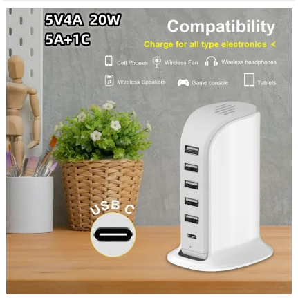 5V4A 20W smart 6 in 1 USB multi port charger compatible different IOS/Android devices , portable MIN