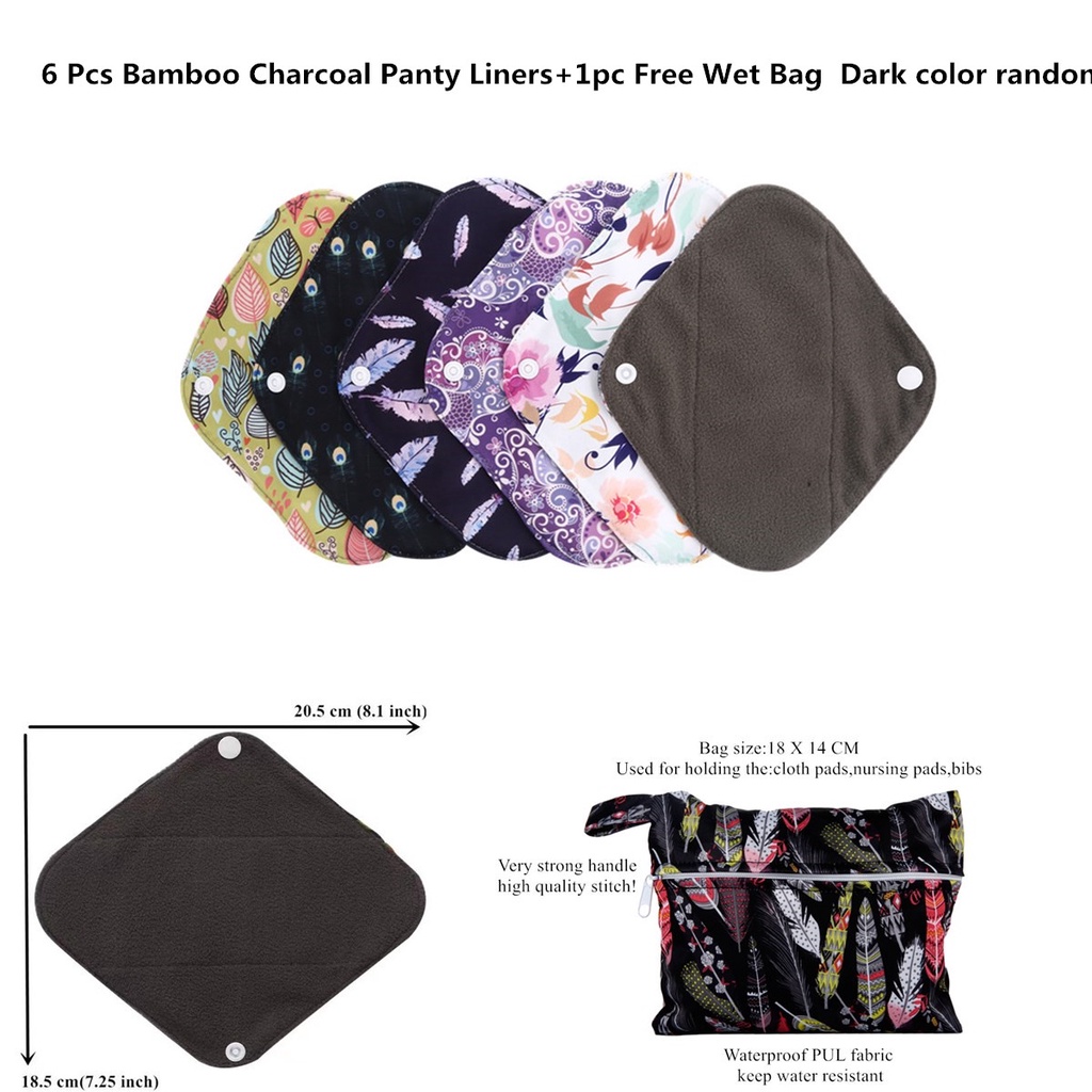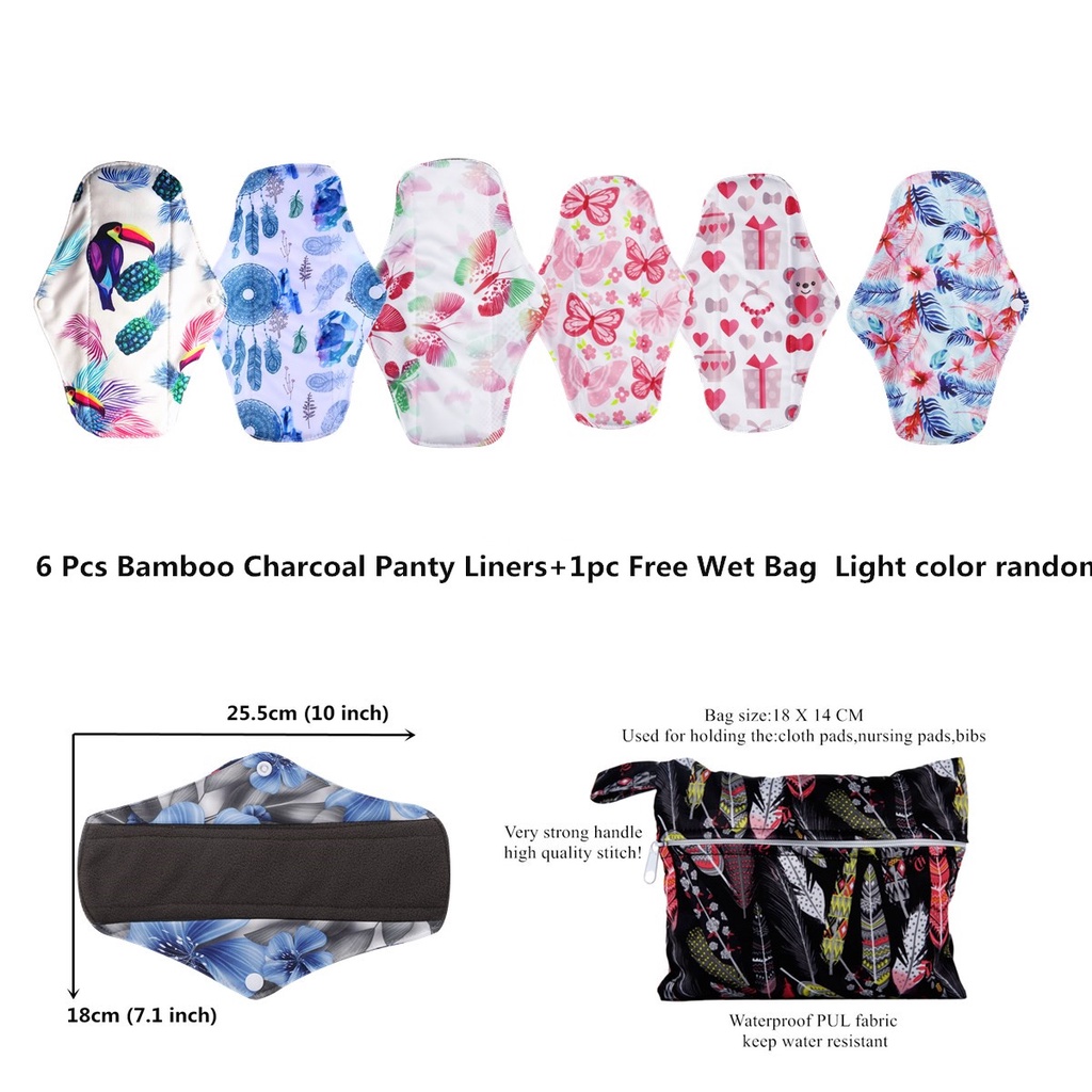 5pcs Bamboo Charcoal Reusable Heavy Flow Menstrual Cloth Pads Set +1pc FreeWetBag