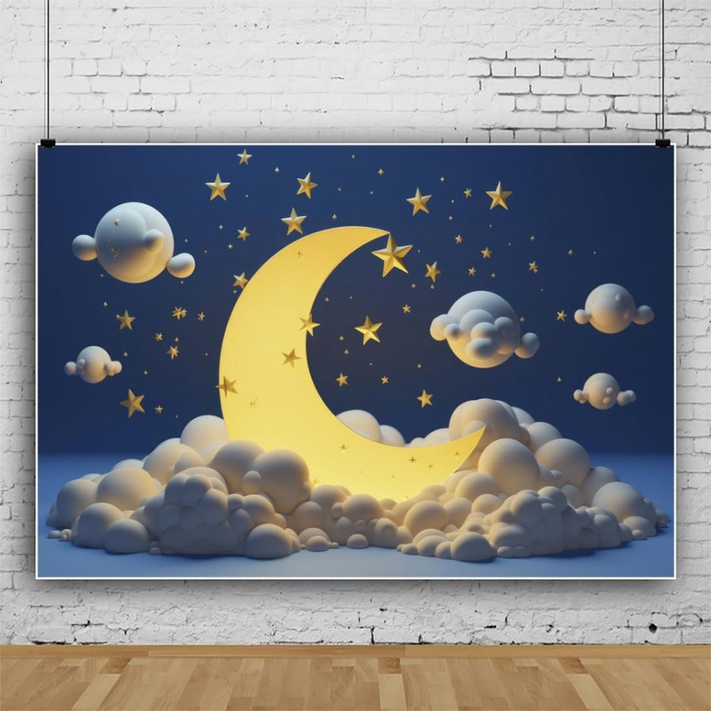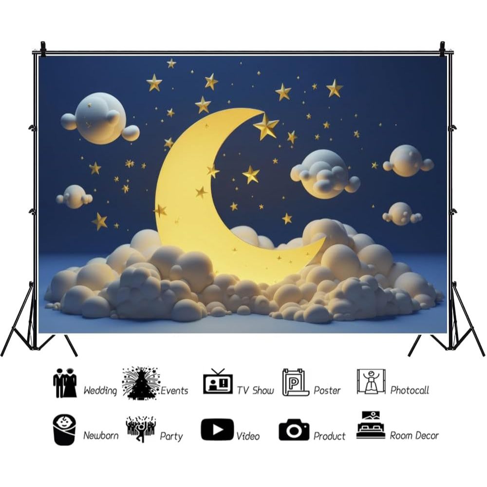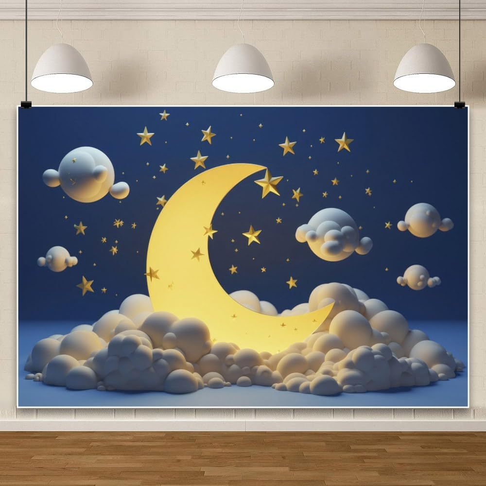 5x3ft Sleeping at Night Photography Backdrop Crescent Moon Golden Stars and Cloud Background for Bedroom Wall Backdrops for Birthday Baby Shower Decorations Photo Booth Props