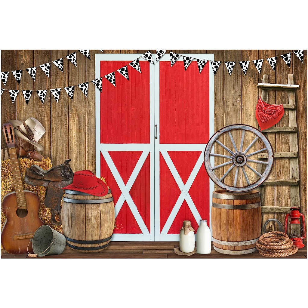 5x3ft Western Cowboy Scene Photography Backdrop Red Barn Door Farm BBQ Party Decoration Background Photo Booth