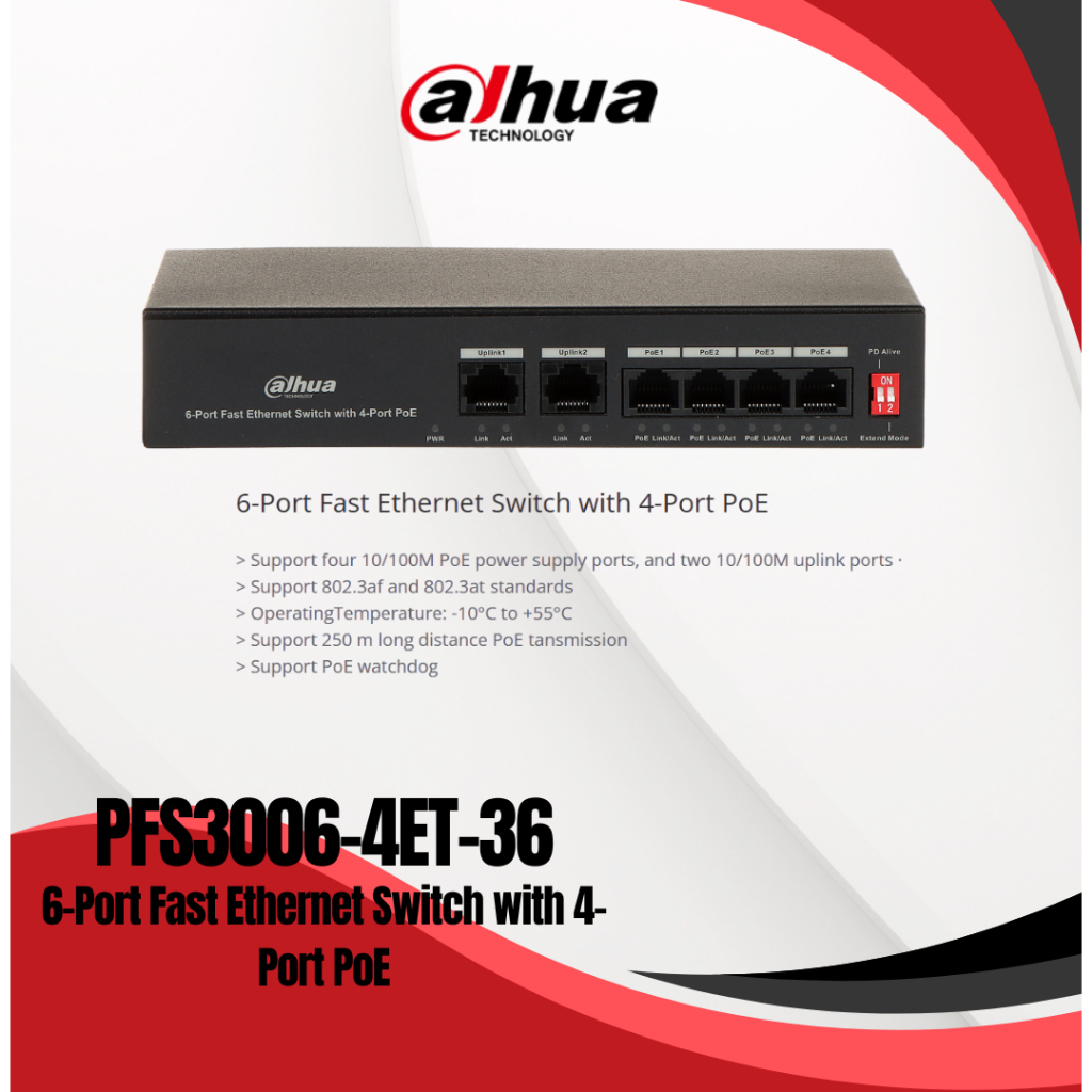 6-Port Fast Ethernet Switch with 4-Port PoE 36W (DH-PFS3006-4ET-36)