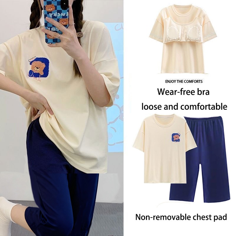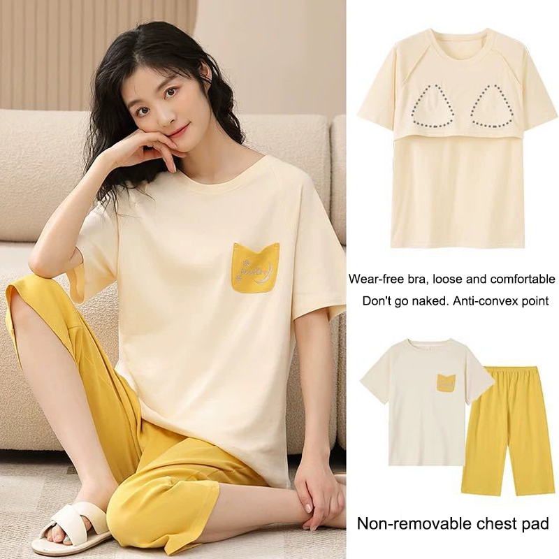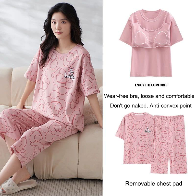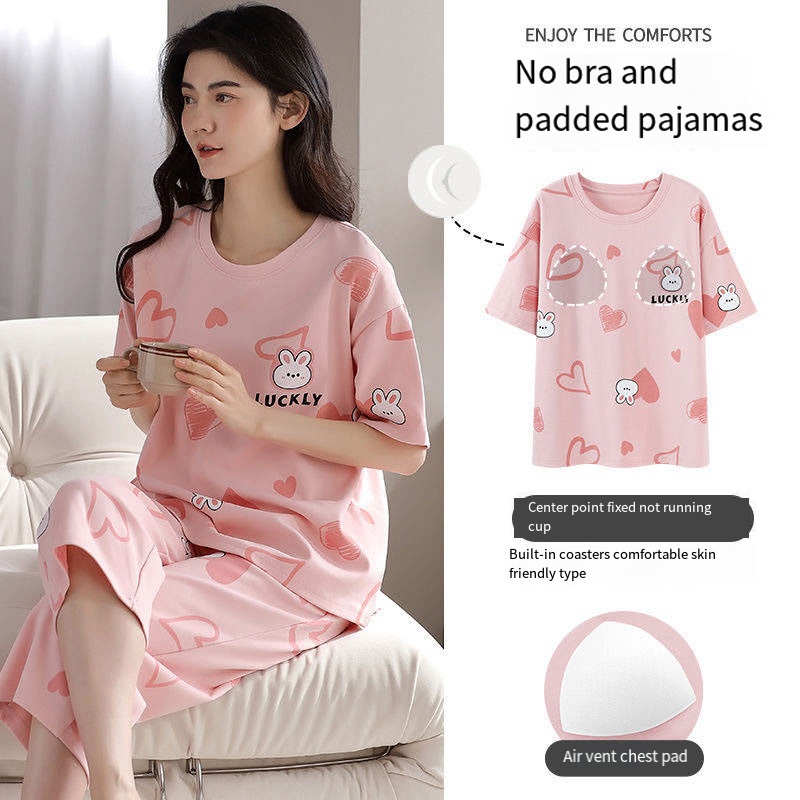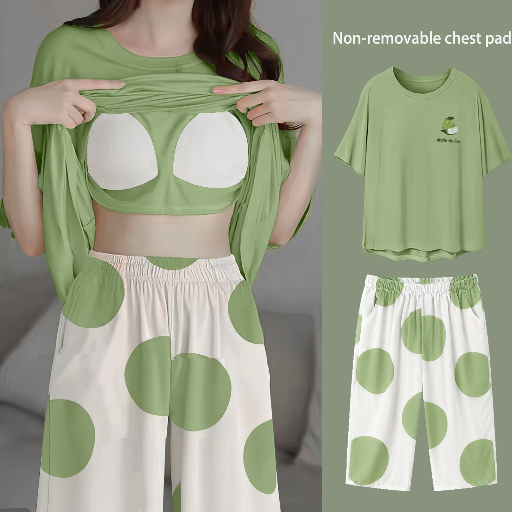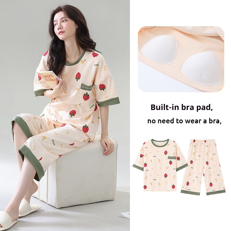 Nava New Women's Pajamas/Sleepwear/Nightwear 3/4 Pants/Cropped Pants/Round Neck Shirt Set Chest Pad