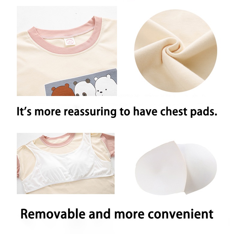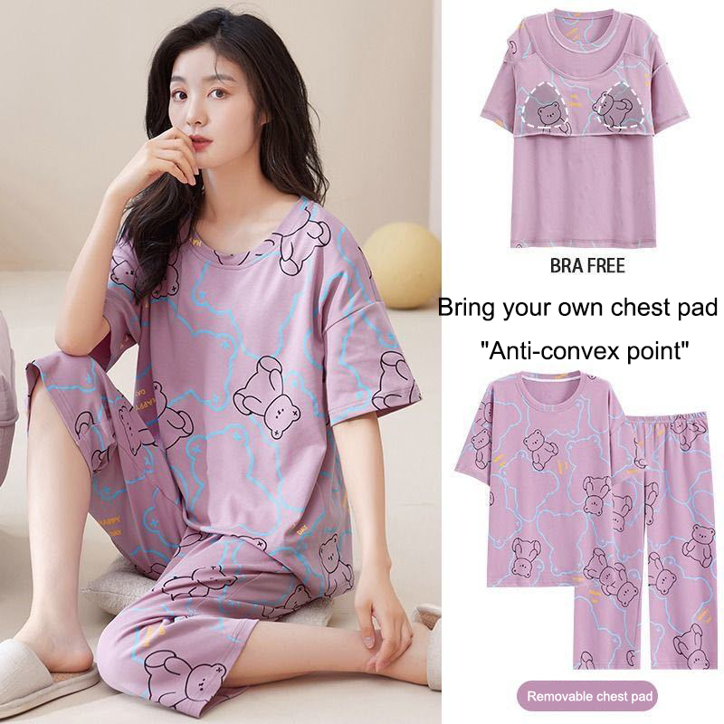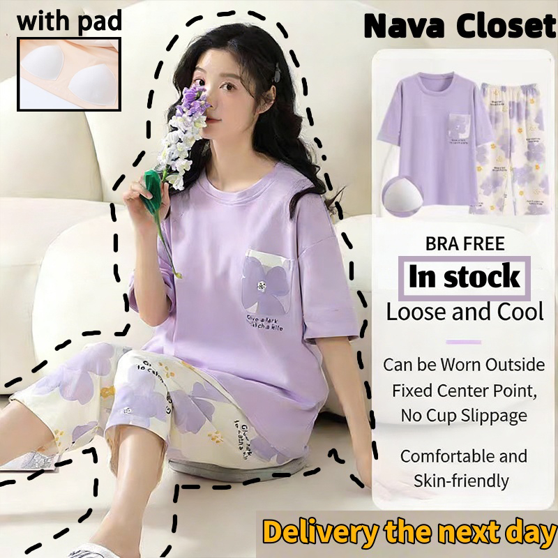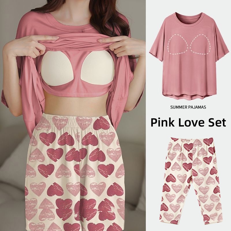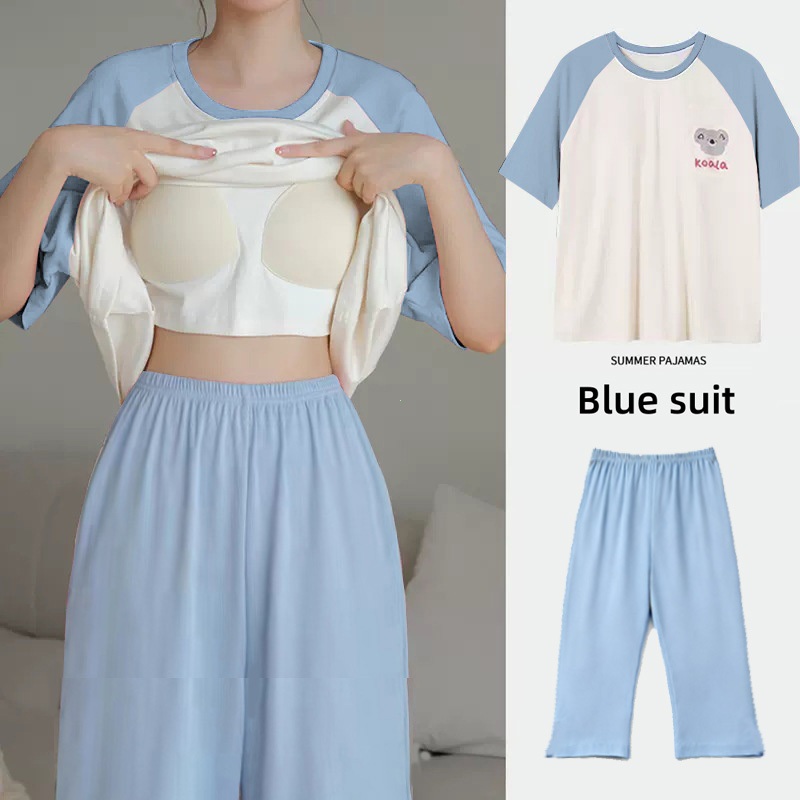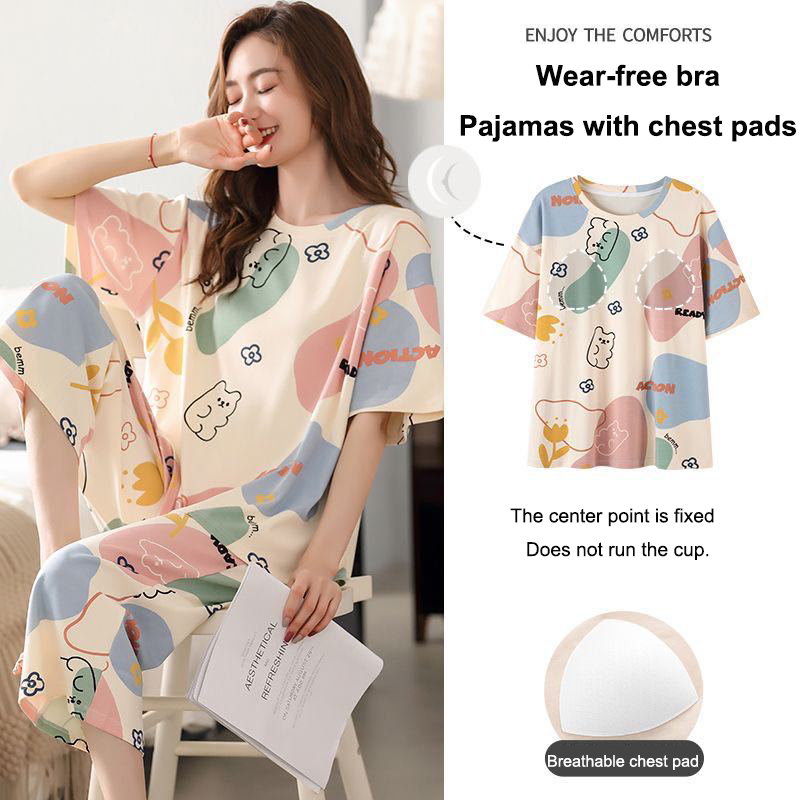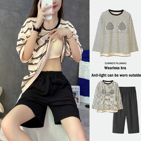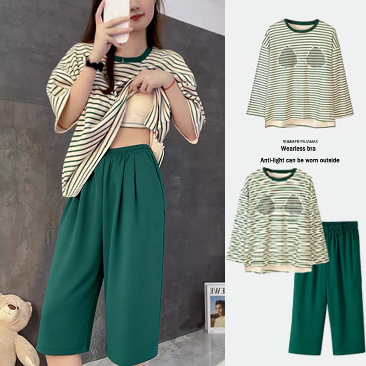 Nava New Women's Pajamas/Sleepwear/Nightwear 3/4 Pants/Cropped Pants/Round Neck Shirt Set Chest Pad