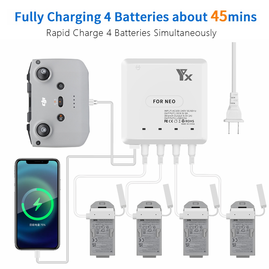 6 in 1 Battery Charger for For DJI NEO Drone Battery Charging Hub Fast Smart Battery Charger with USB Port